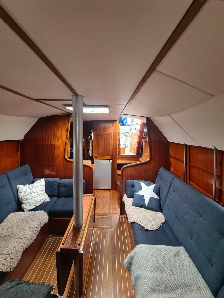Inside, the boat has a diesel heater, fridge (new cooling unit 2022), pressurized water, gas stove with oven, and a new Jabsco toilet (2023). Teak in the cockpit and a cockpit tent add comfort for longer stays aboard.
