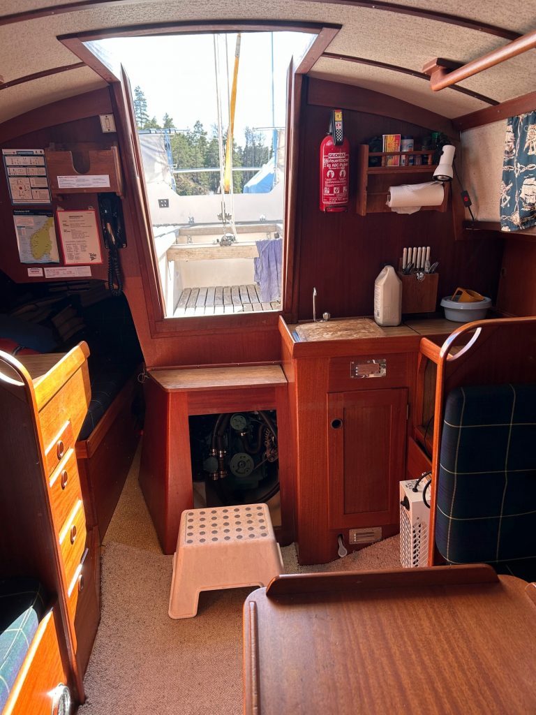 The teak interior looks very good. The cushions were re-sewn. The galley has a stove and Isotherm refrigerator with a new compressor.