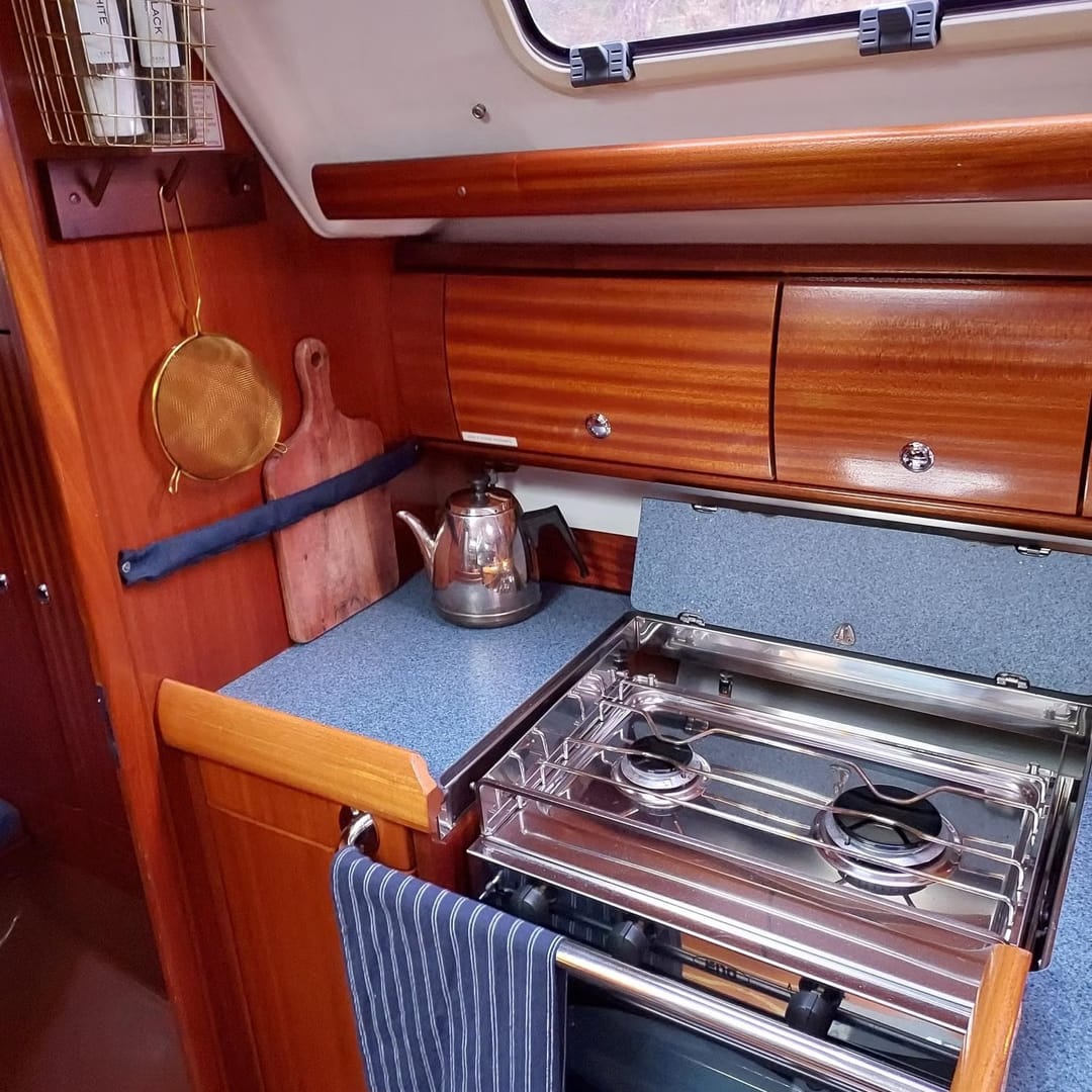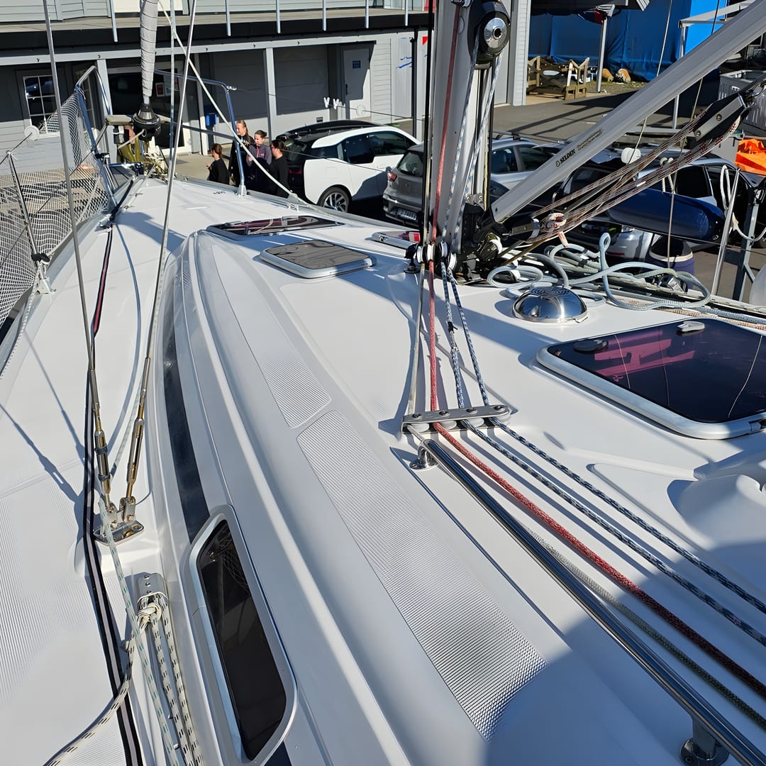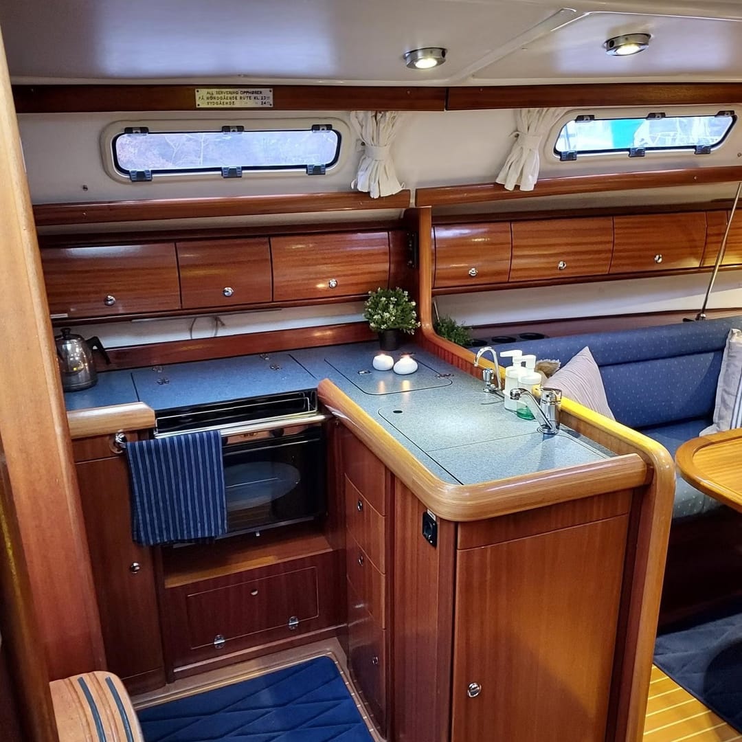 Handling is predictable and simple, with furling mainsail and genoa. Solo sailing is easy. The engine is reliable and well maintained. The 1.65 m draft gives access to most harbors and anchorages.