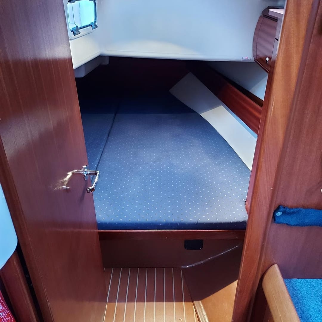 The interior is in very good condition. Warm woodwork and a bright saloon create a cozy atmosphere. The layout includes a spacious head with drying locker and a large starboard storage hatch.