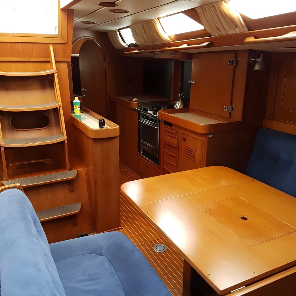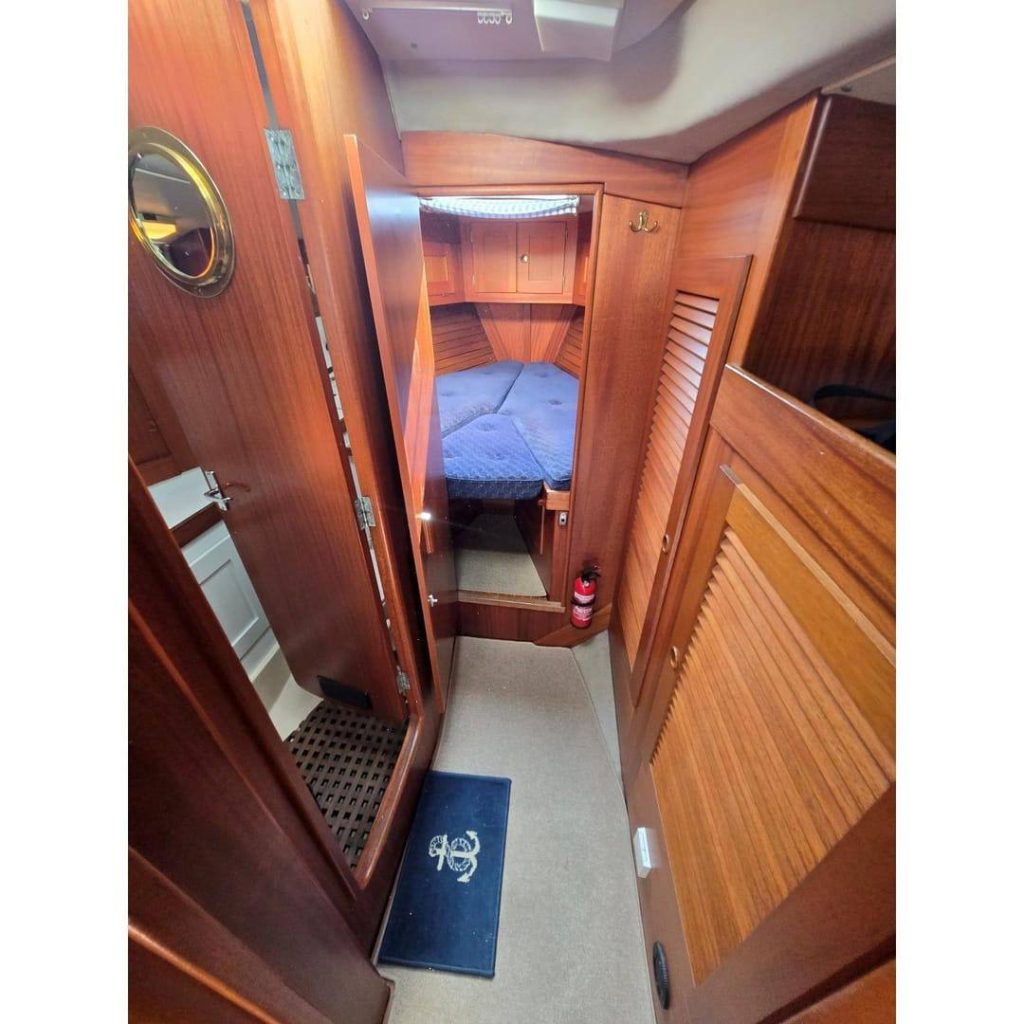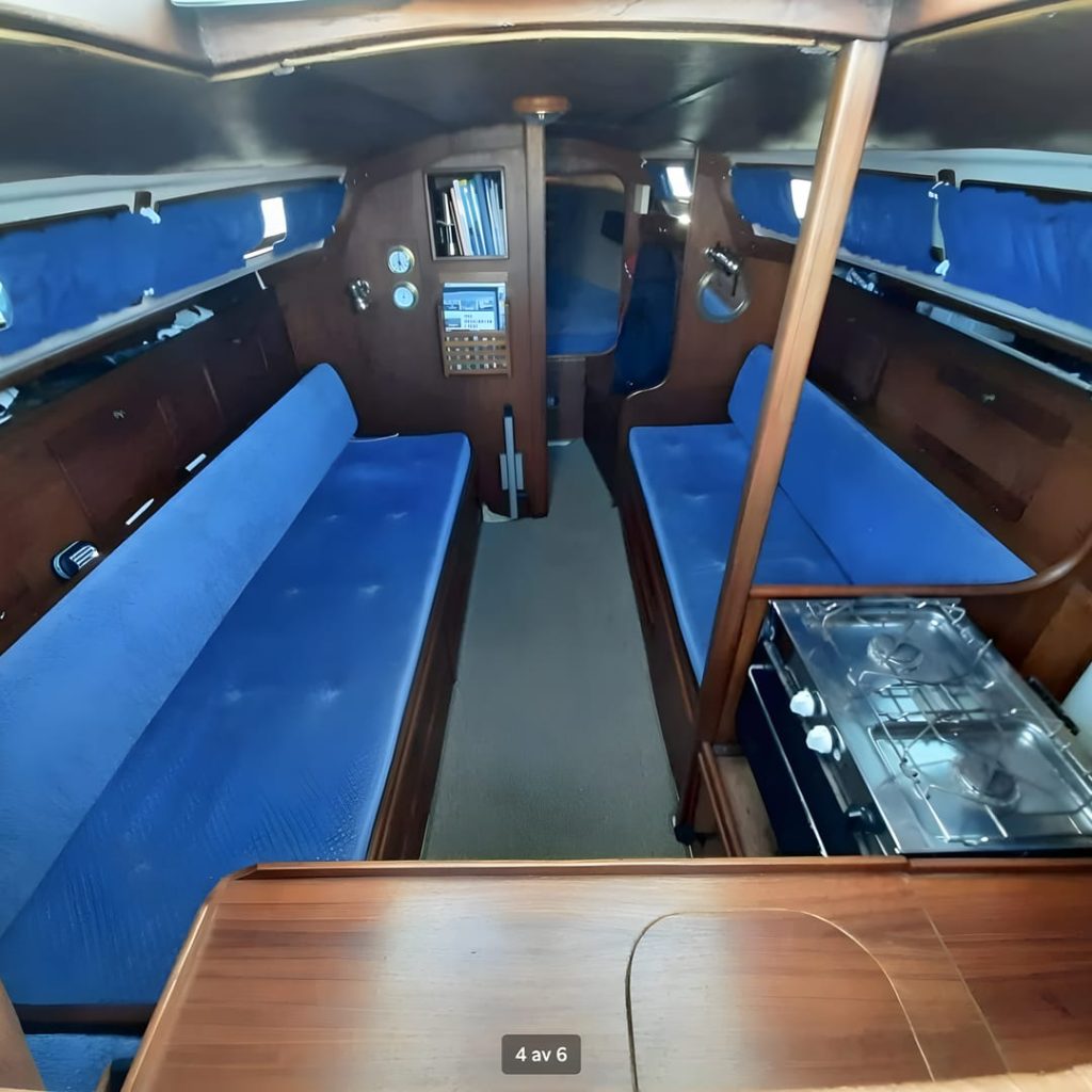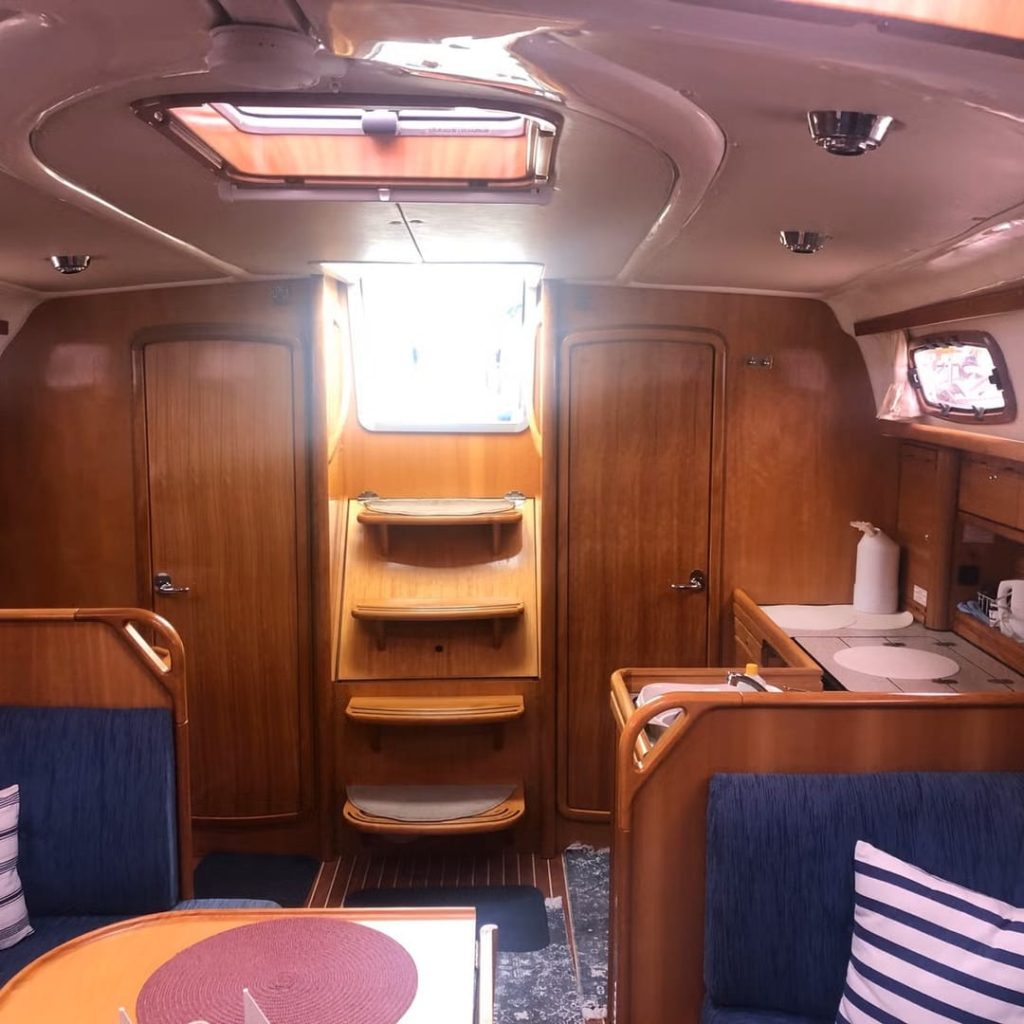 The interior is in excellent condition for a Bavaria of this age. The woodwork and upholstery show careful maintenance, as seen in the photos. Storage is practical, with deep lockers and extra space accessible from the cockpit.