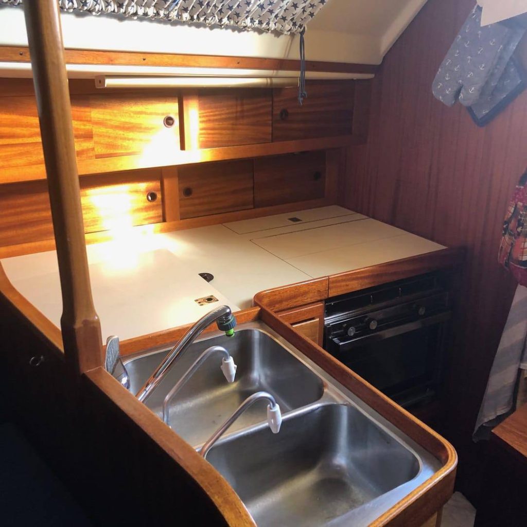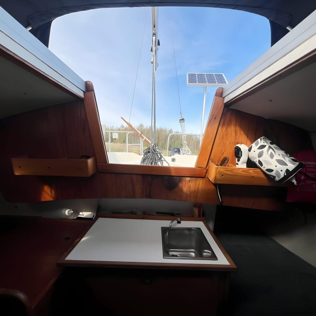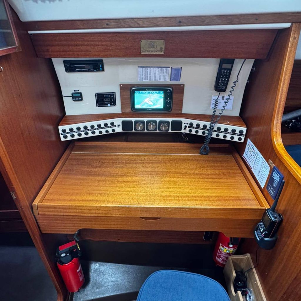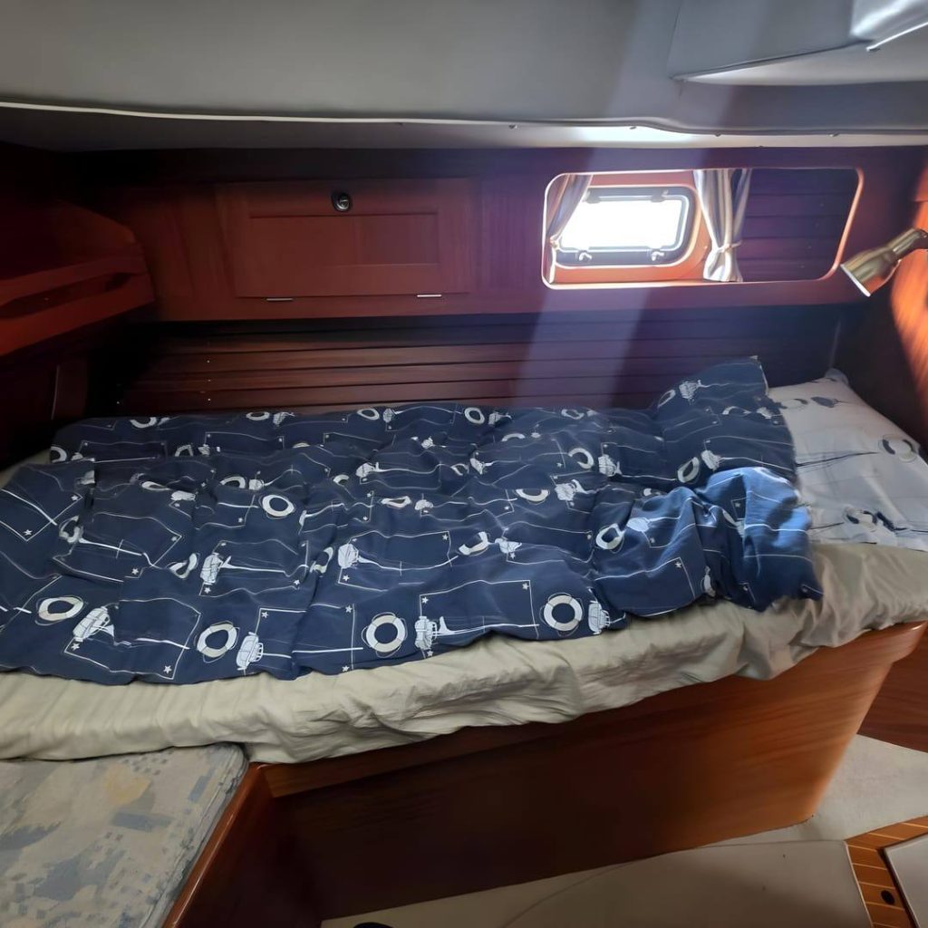 The interior is in excellent condition for a Bavaria of this age. The woodwork and upholstery show careful maintenance, as seen in the photos. Storage is practical, with deep lockers and extra space accessible from the cockpit.