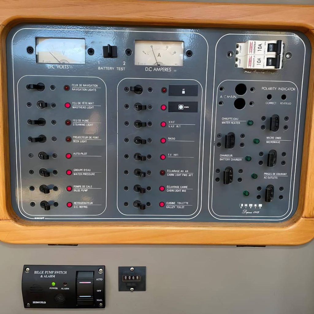 The boat has crossed the Atlantic twice. She is prepared for extended autonomous cruising, with upgrades to key systems and storage. The engine room is well organized for easy access and maintenance.
