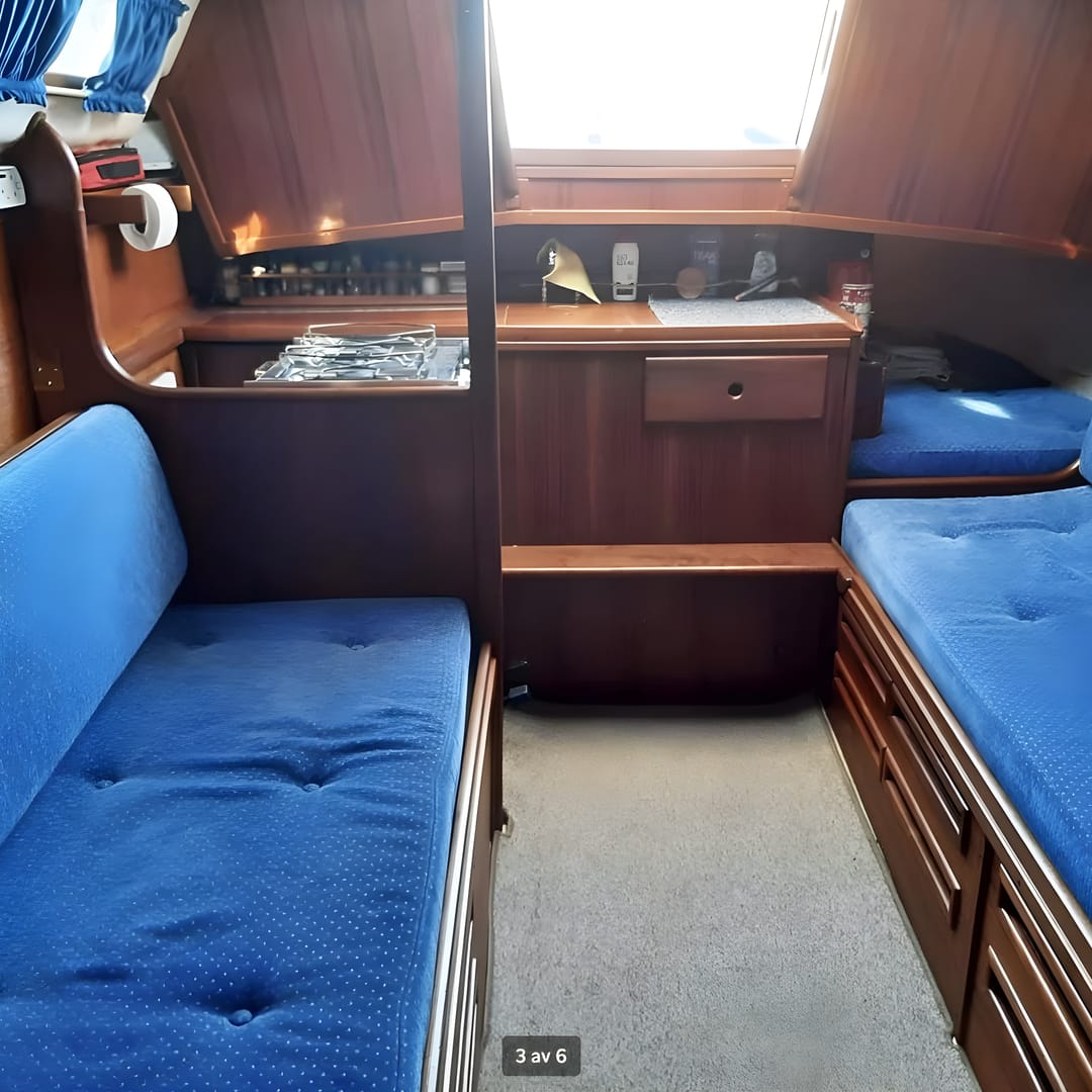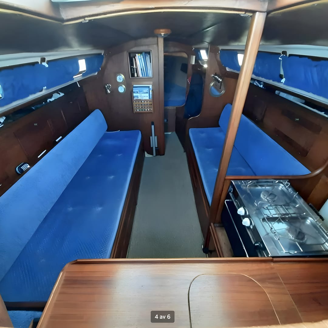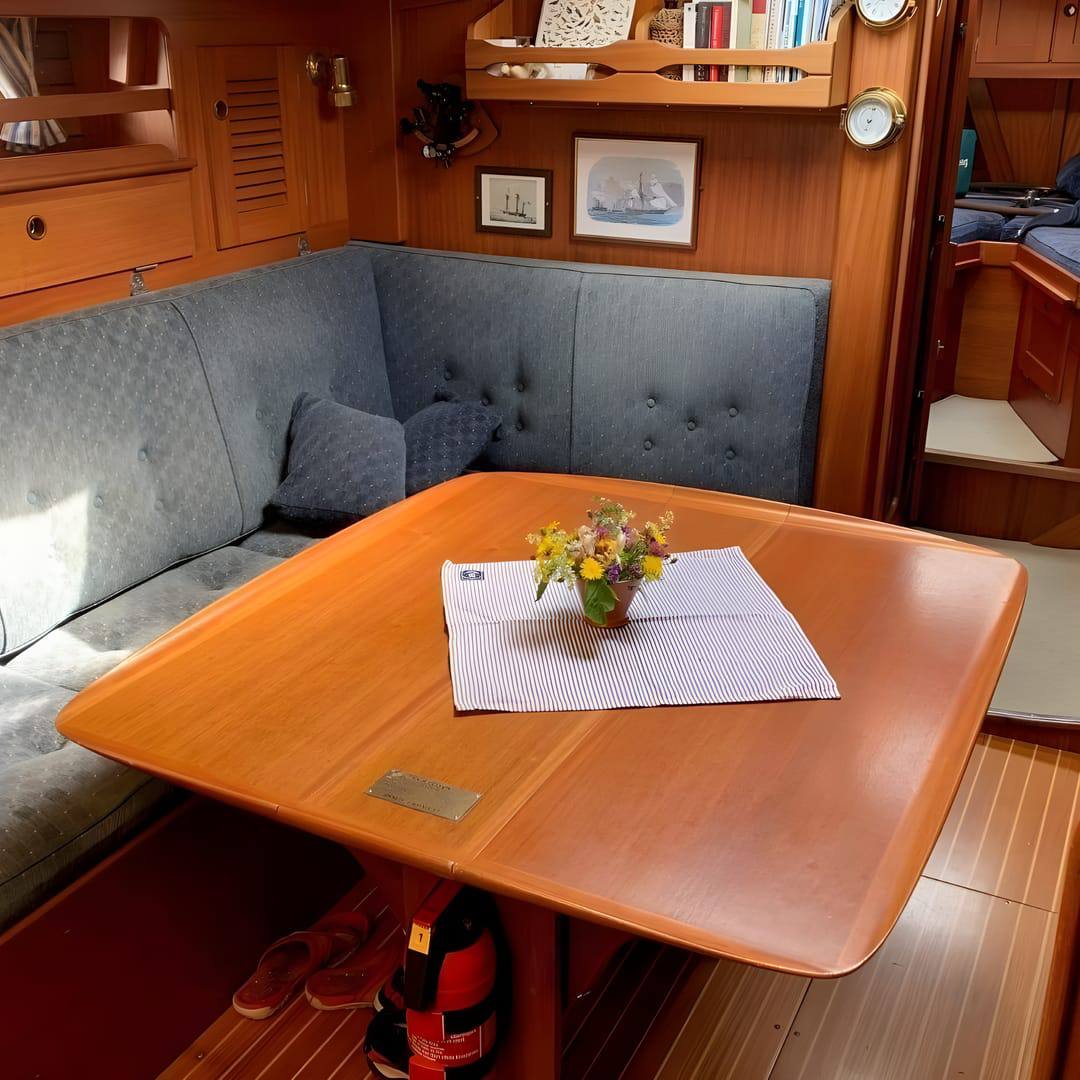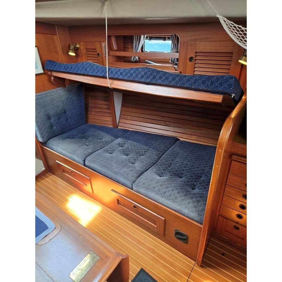 The interior is in excellent condition for a Bavaria of this age. The woodwork and upholstery show careful maintenance, as seen in the photos. Storage is practical, with deep lockers and extra space accessible from the cockpit.