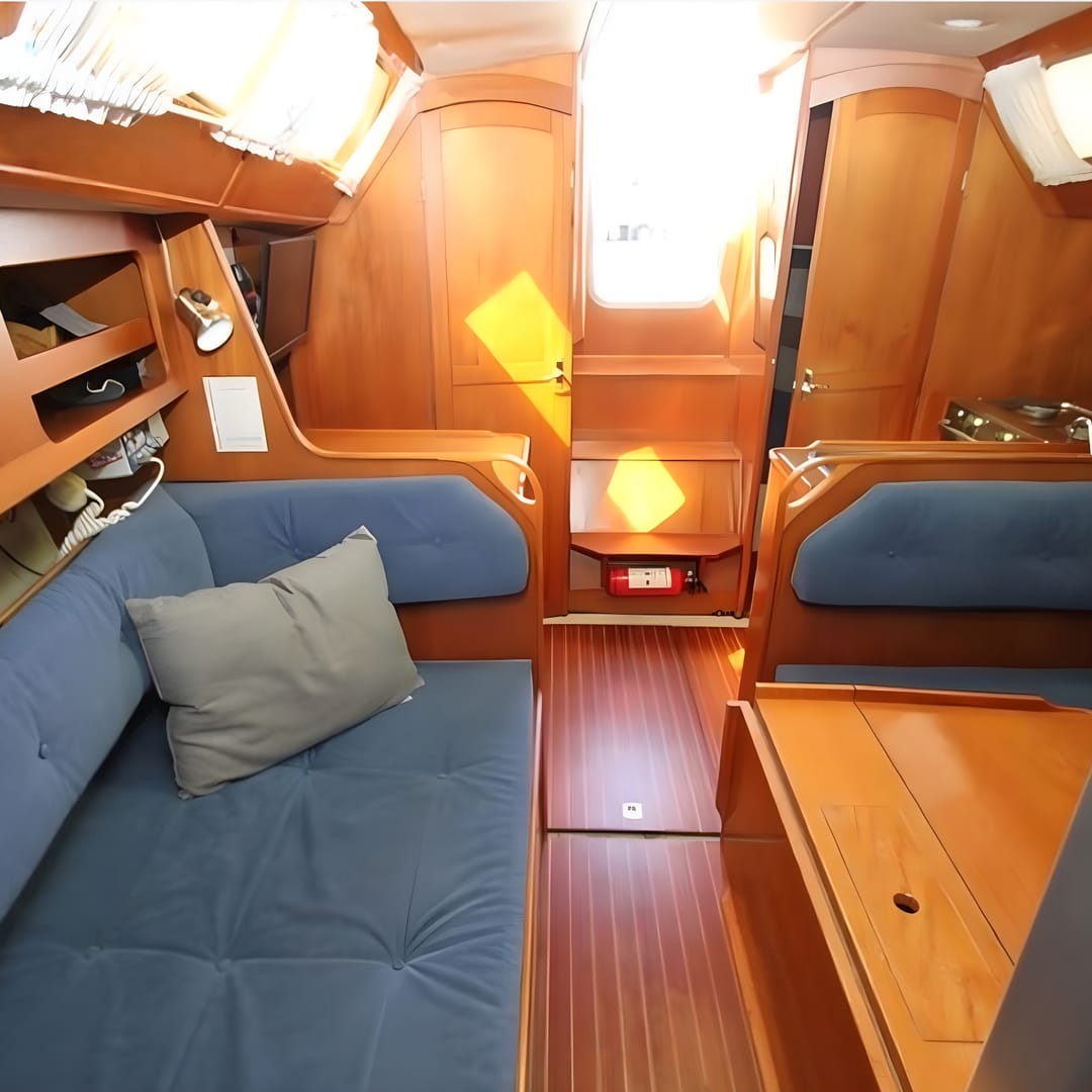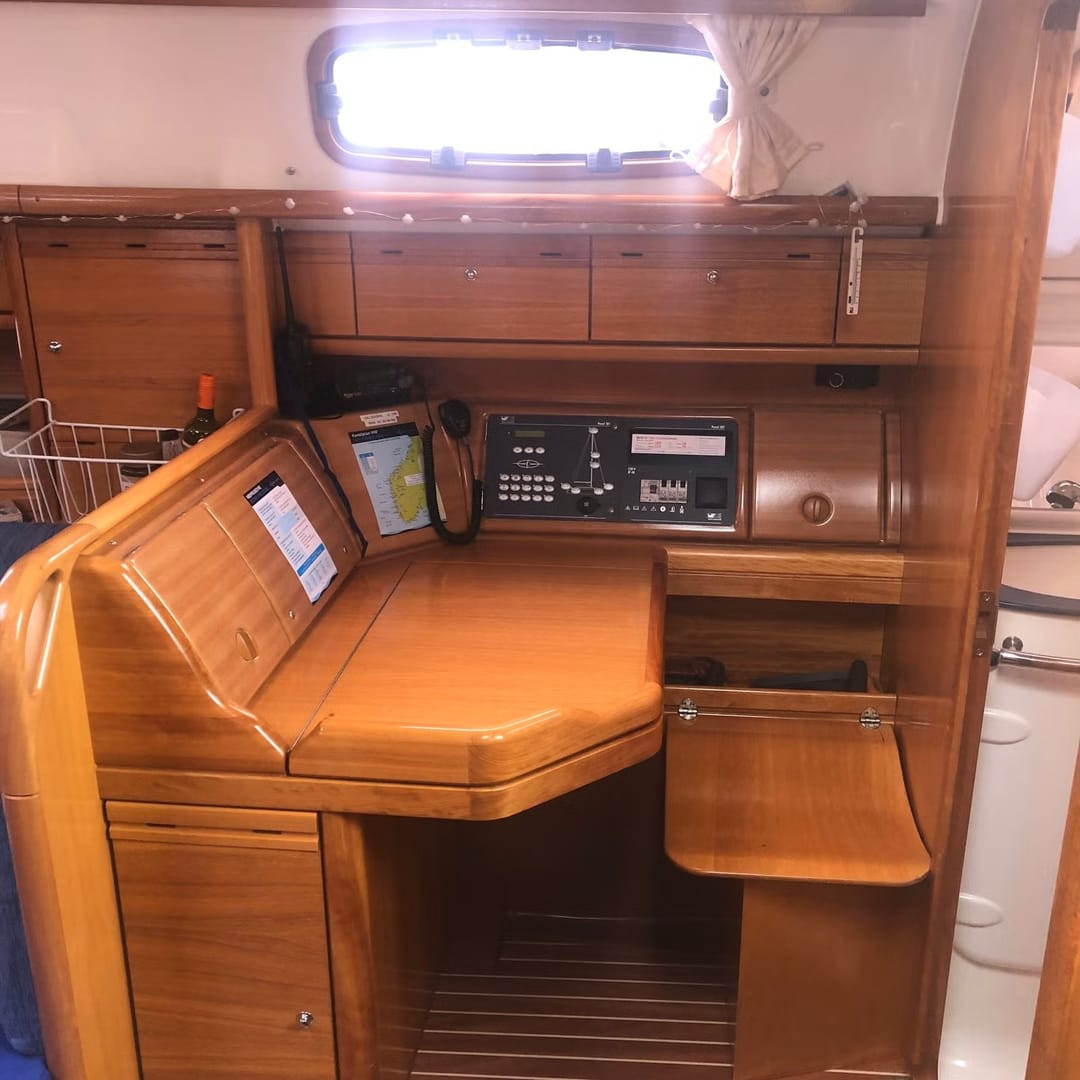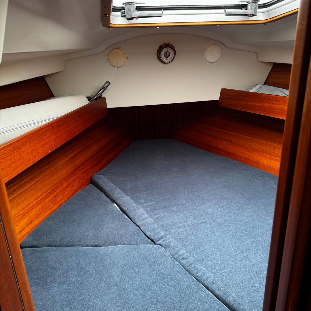 The interior is in excellent condition for a Bavaria of this age. The woodwork and upholstery show careful maintenance, as seen in the photos. Storage is practical, with deep lockers and extra space accessible from the cockpit.
