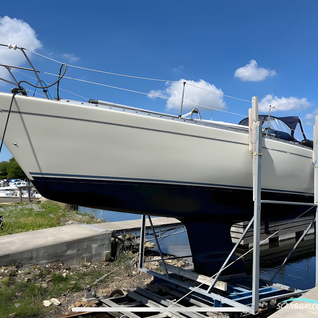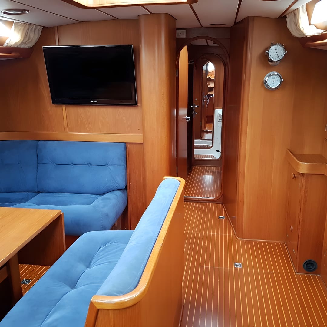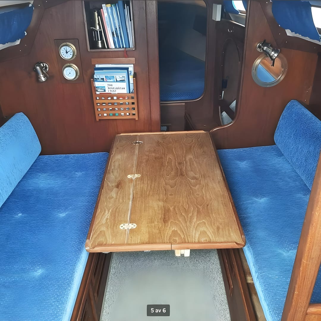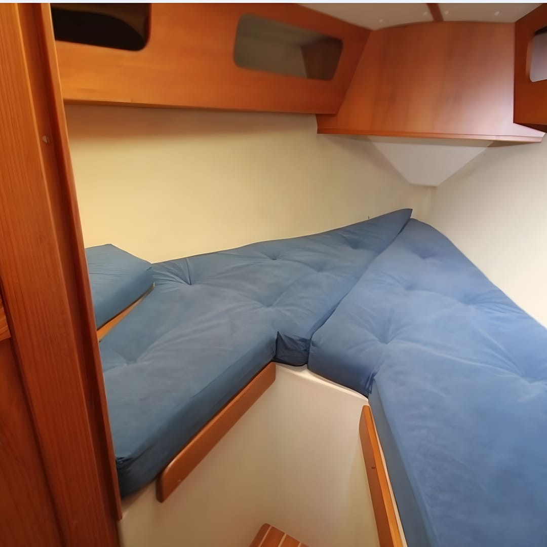 The interior is in excellent condition for a Bavaria of this age. The woodwork and upholstery show careful maintenance, as seen in the photos. Storage is practical, with deep lockers and extra space accessible from the cockpit.