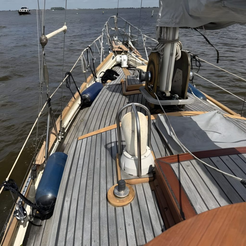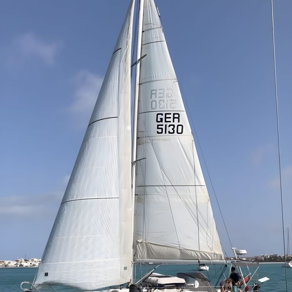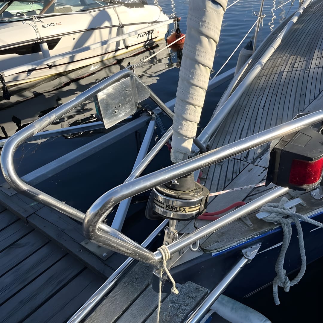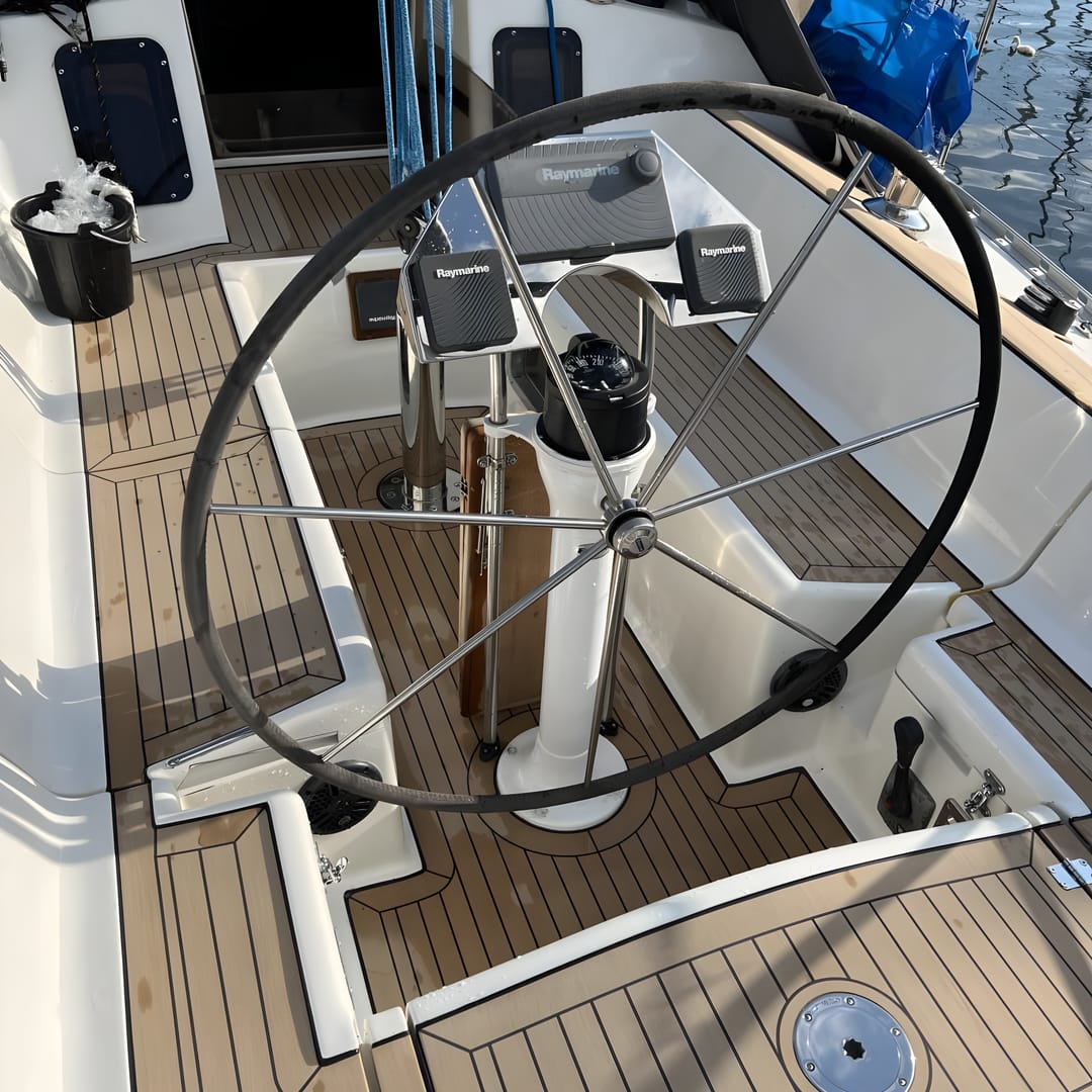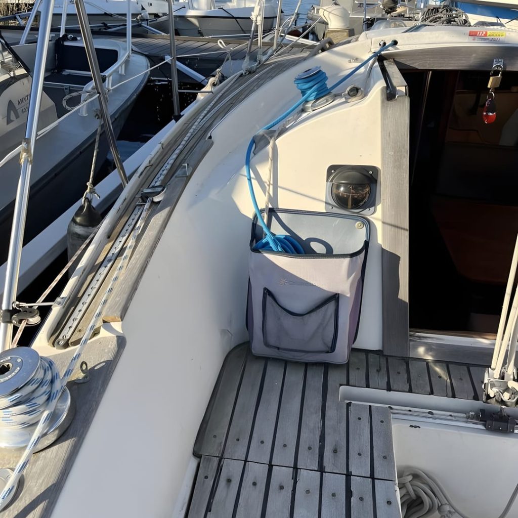 The sail inventory includes a Hagoort genoa from 2018 and a Furlex furling system. Deck hardware and running rigging are arranged for practical sailing. The swim ladder and cockpit layout are designed for easy access and relaxation.