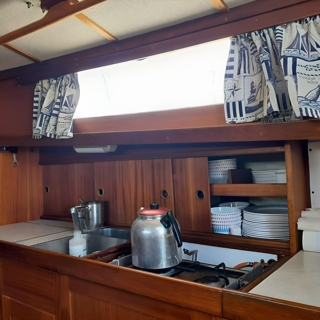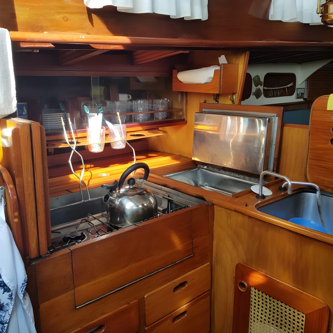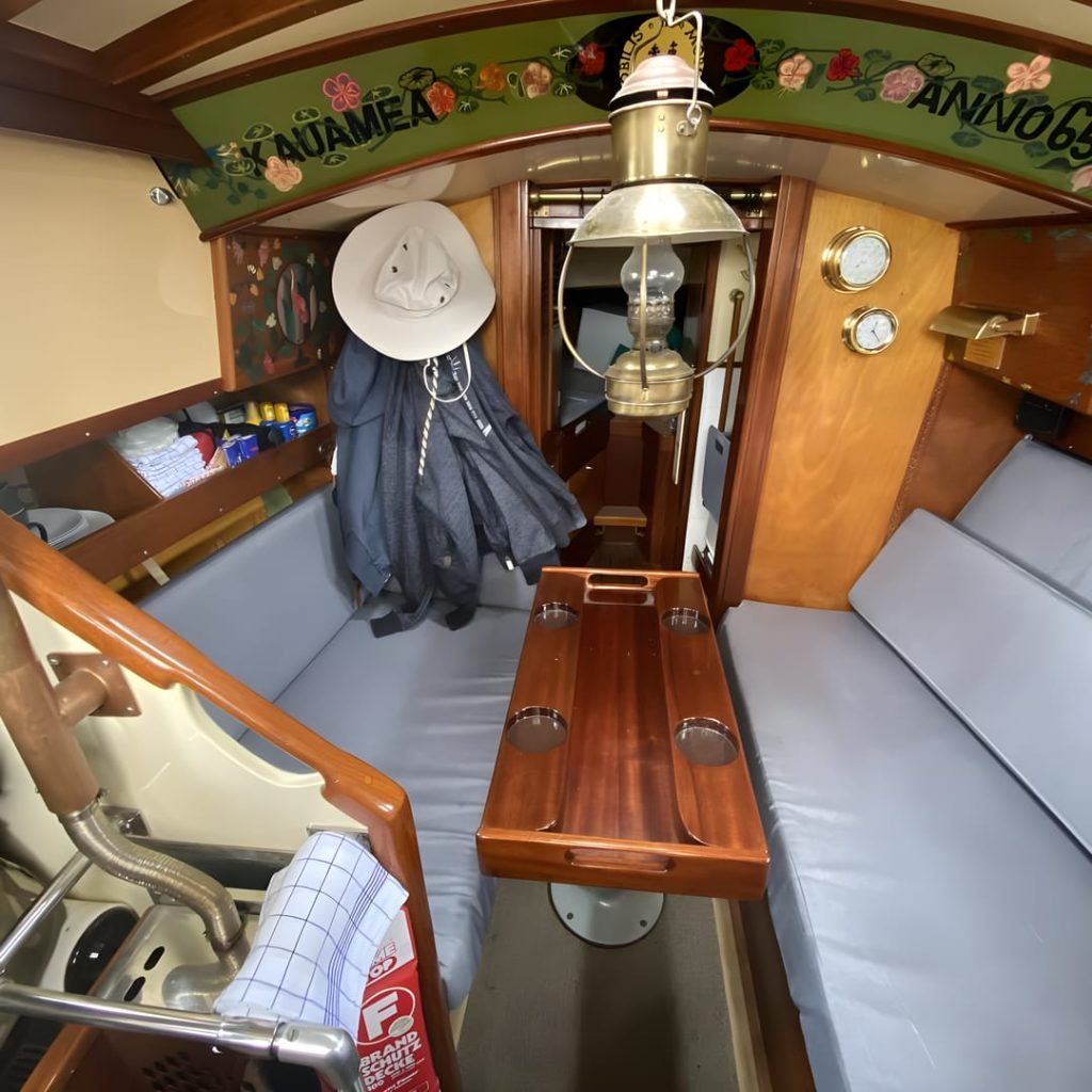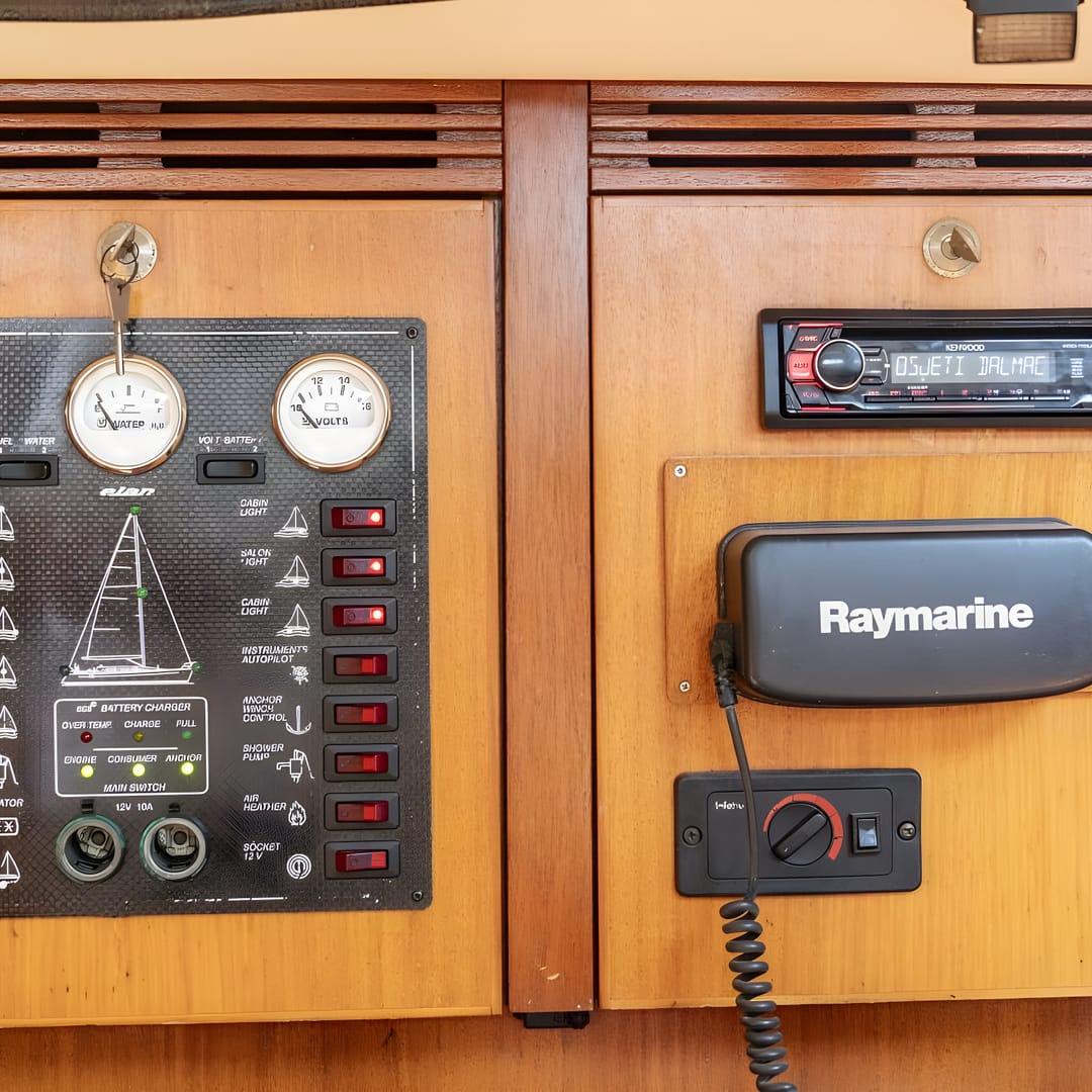 Navigation is supported by depth, speed, and wind instruments. An autopilot wind vane and VHF radio are installed for safe passages. There is a heating system for cooler days on board.