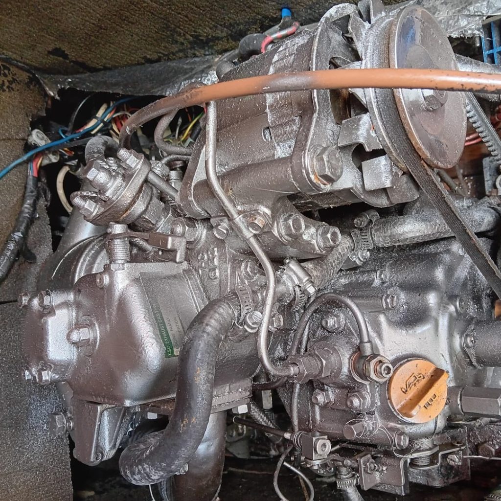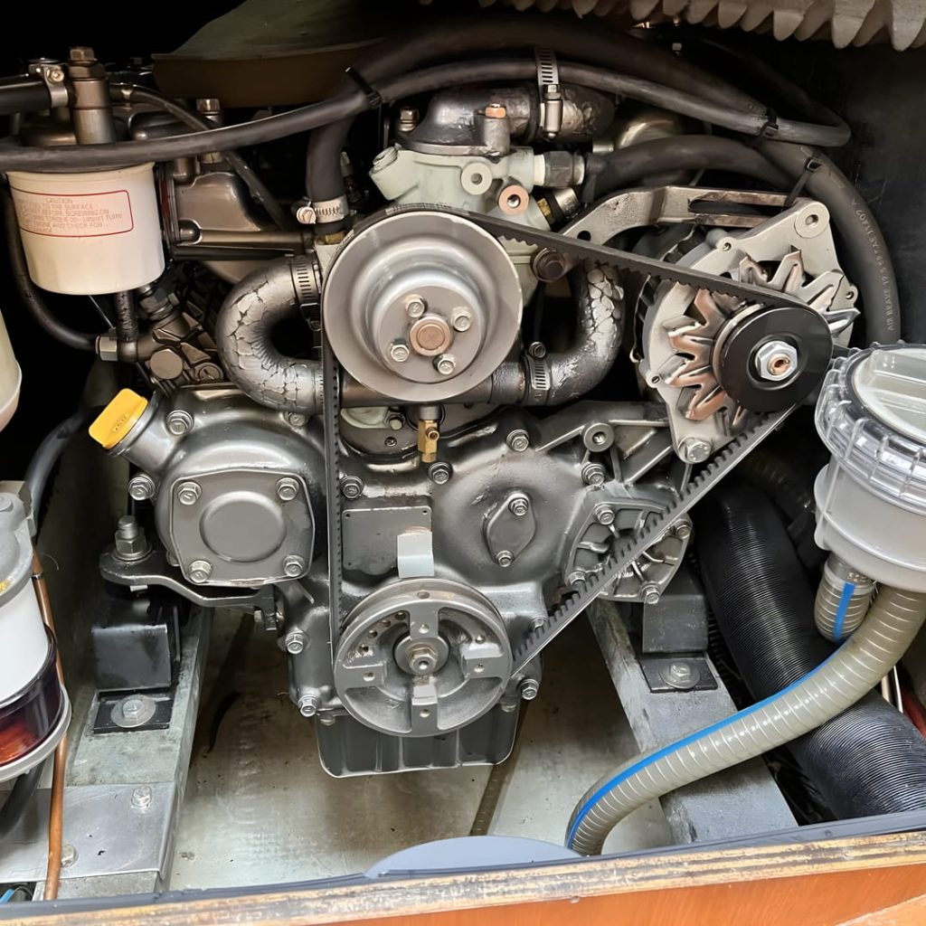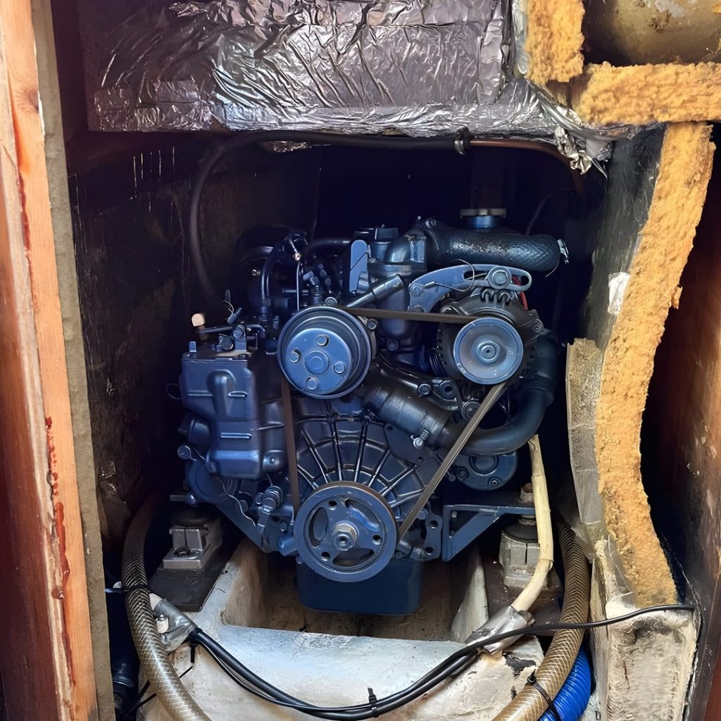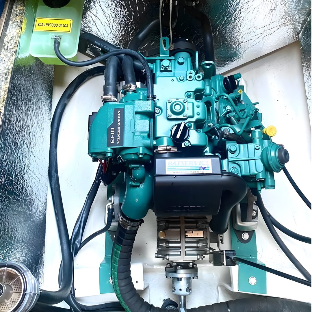 This boat features a Volvo Penta MD2B diesel engine. The propeller shaft was replaced in 2023. The electrical system includes a Victron charger from 2022 and shore power connection.