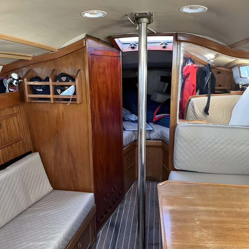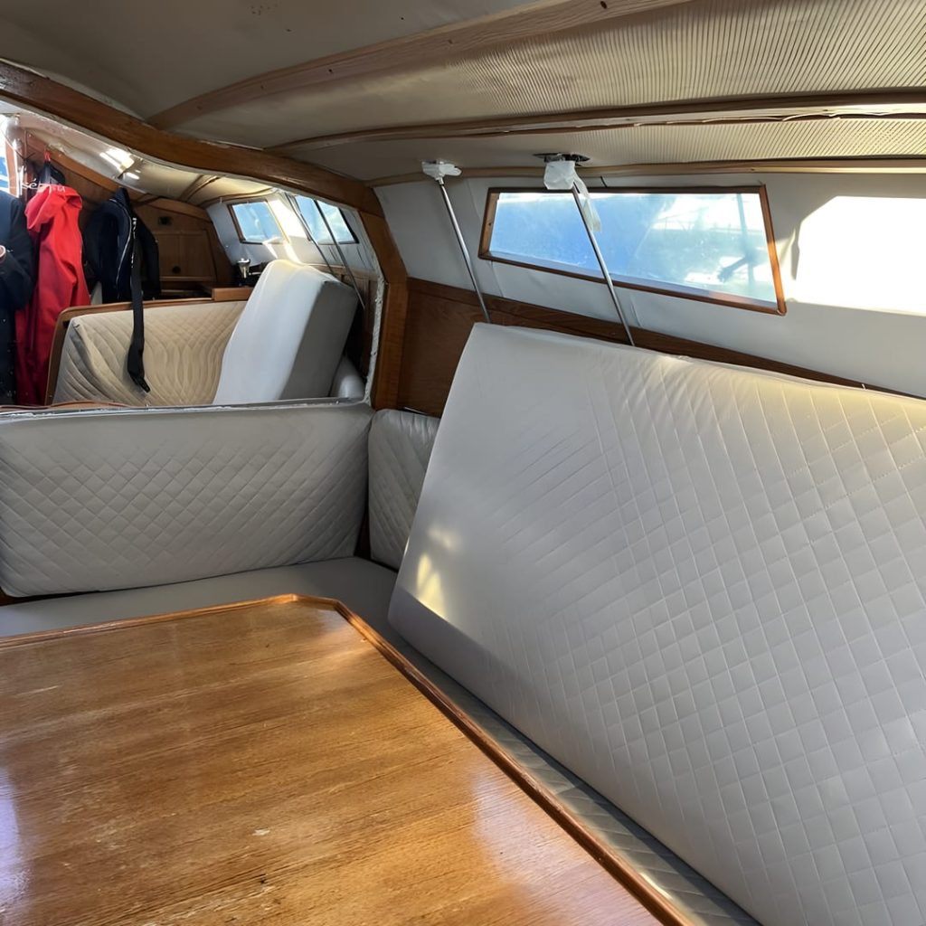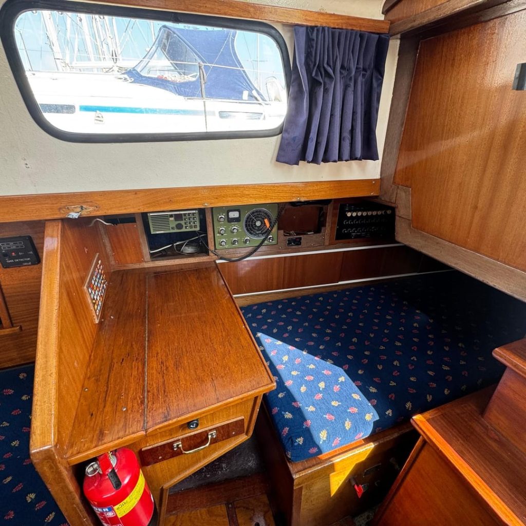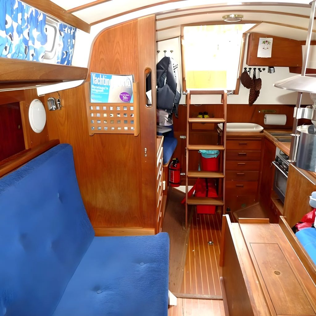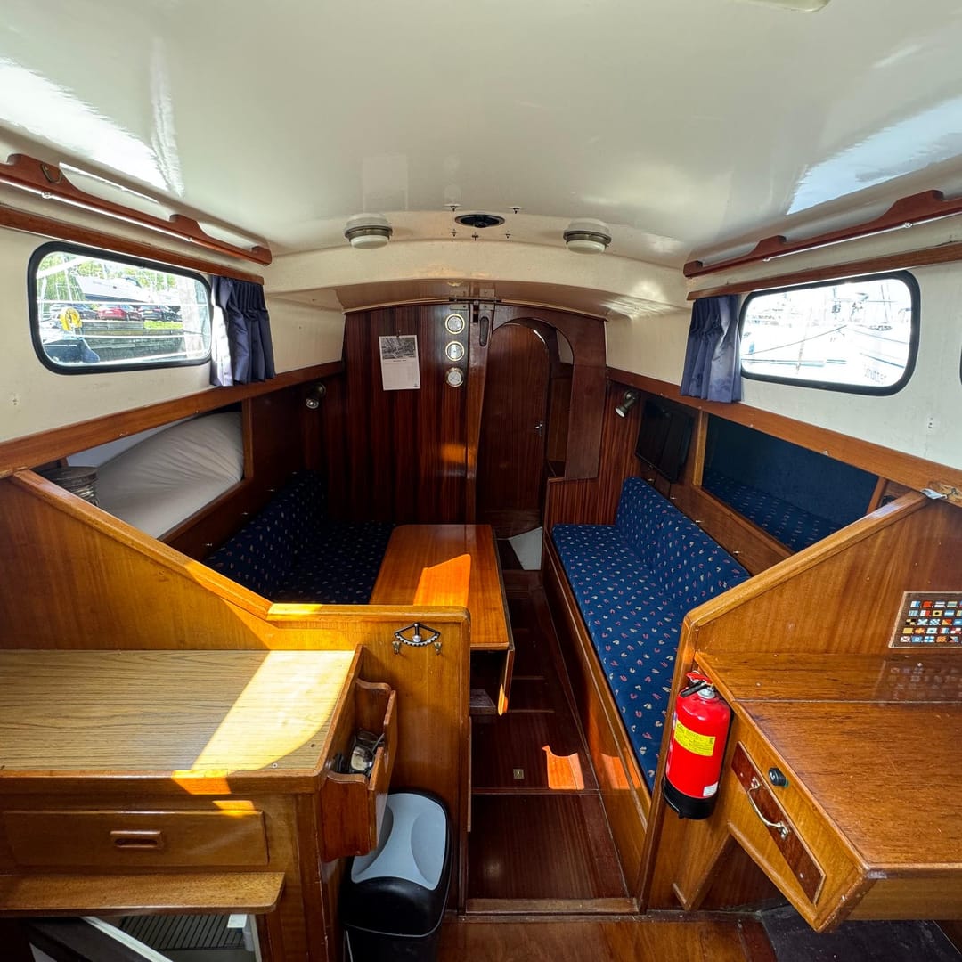 The interior is classic and warm, with blue upholstery and well-kept woodwork. Two cabins and a separate head provide comfort for extended trips. The galley is equipped with a recently installed fridge.