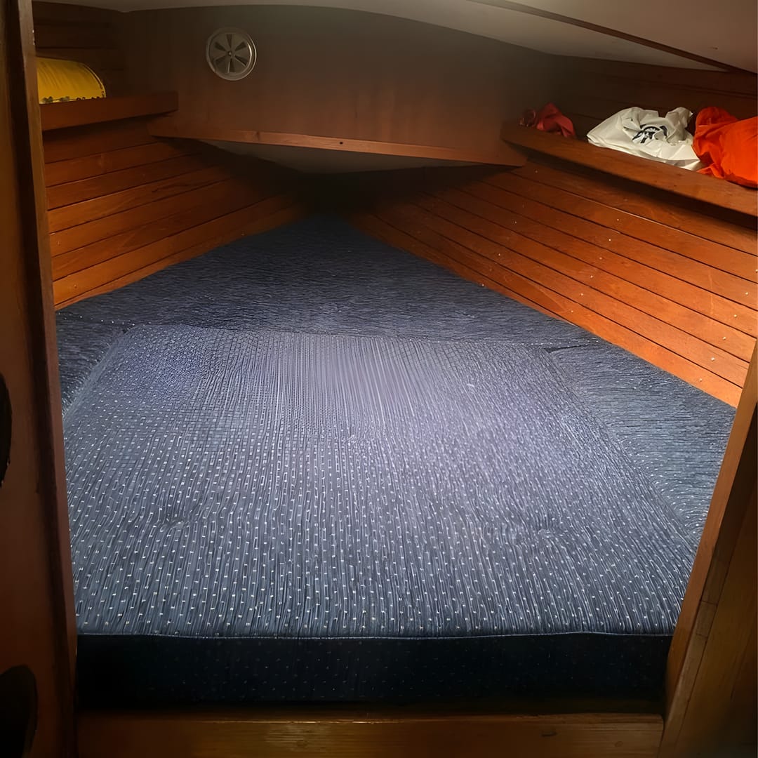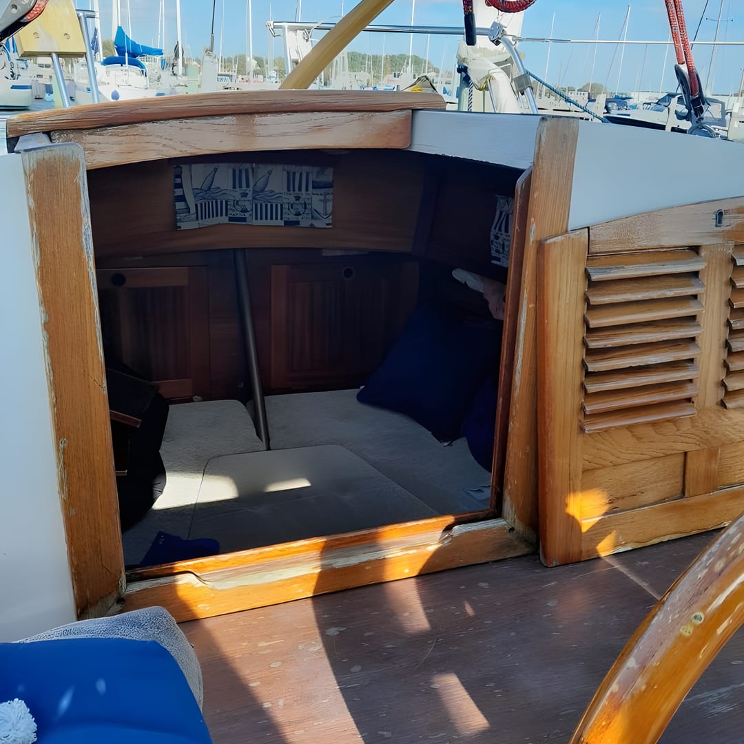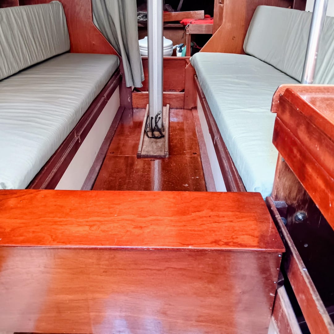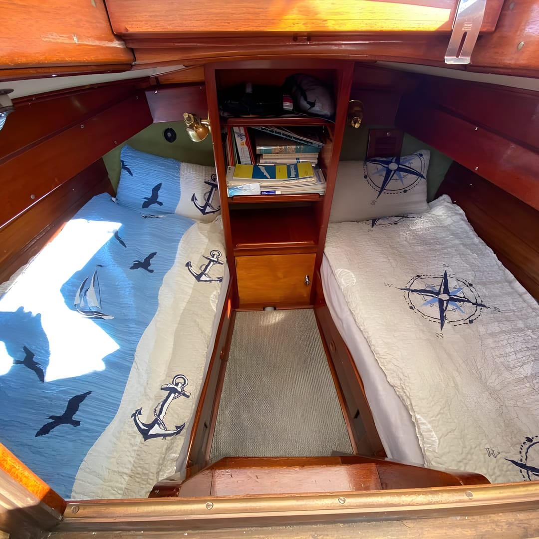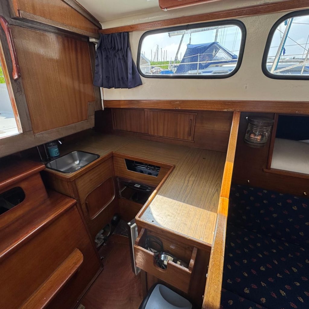 The interior is classic and warm, with blue upholstery and well-kept woodwork. Two cabins and a separate head provide comfort for extended trips. The galley is equipped with a recently installed fridge.