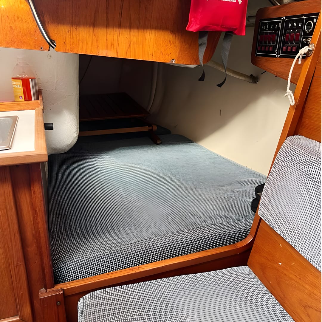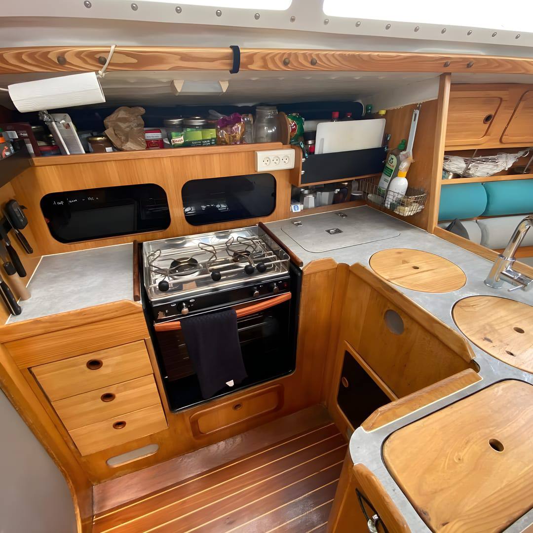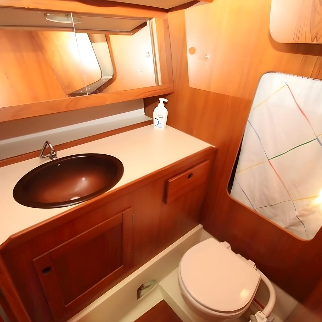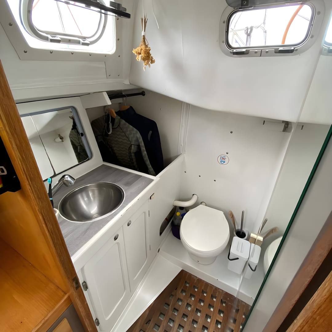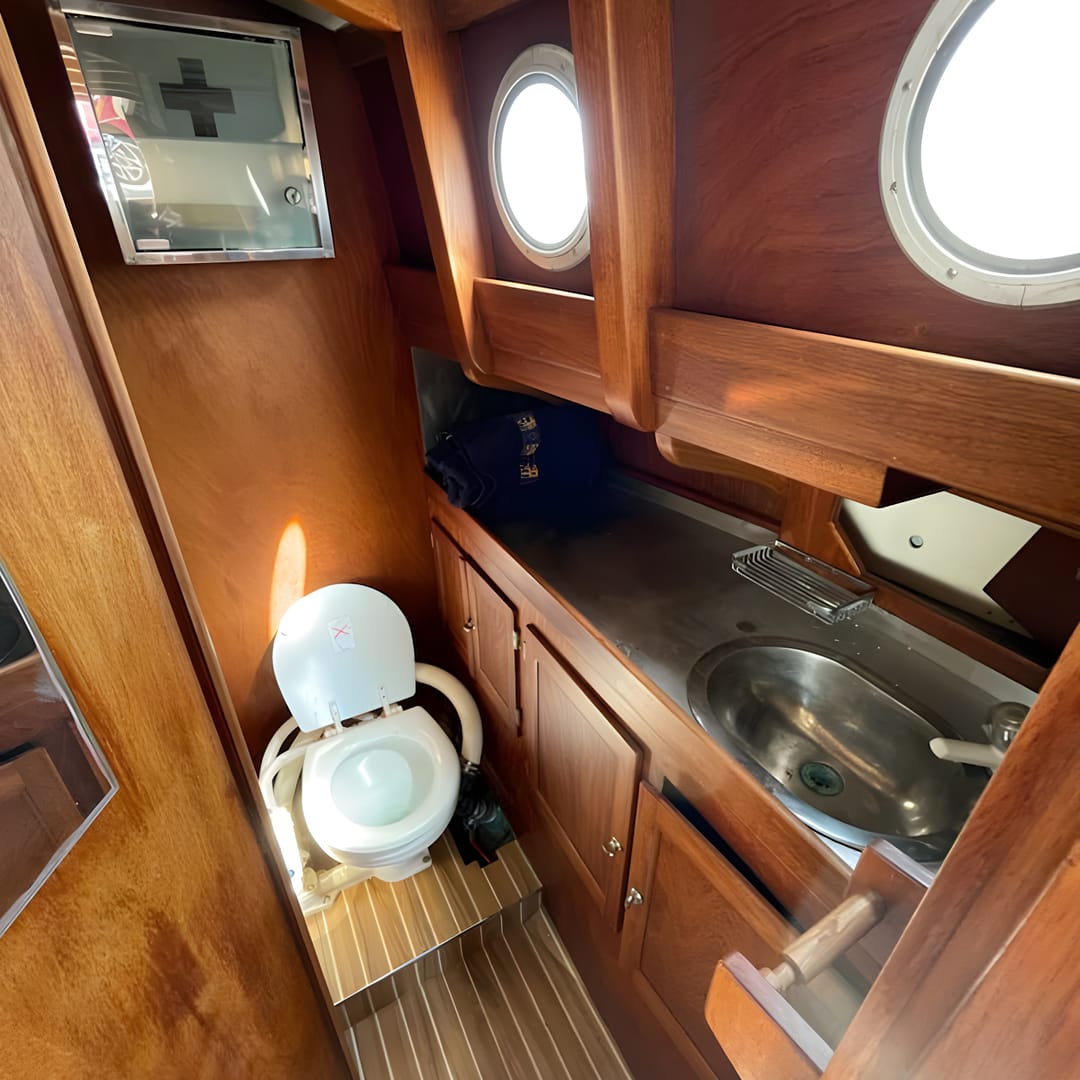 🍴 Comfort: fridge, stove with 2 burners, diesel heater, shower inside and aft, hot water, toilet with holding tank