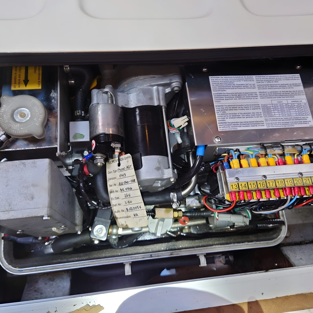 The boat has crossed the Atlantic twice. She is prepared for extended autonomous cruising, with upgrades to key systems and storage. The engine room is well organized for easy access and maintenance.