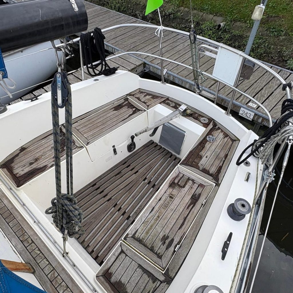 The deck and cockpit layout are practical for single-handed or small-crew sailing. The boat has an autopilot, two self-tailing winches, and a Selden rod kicker. The sprayhood and boom cover are in good condition.