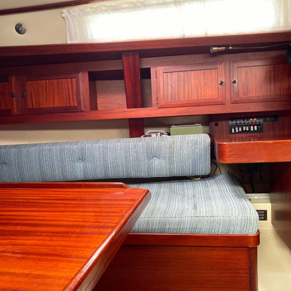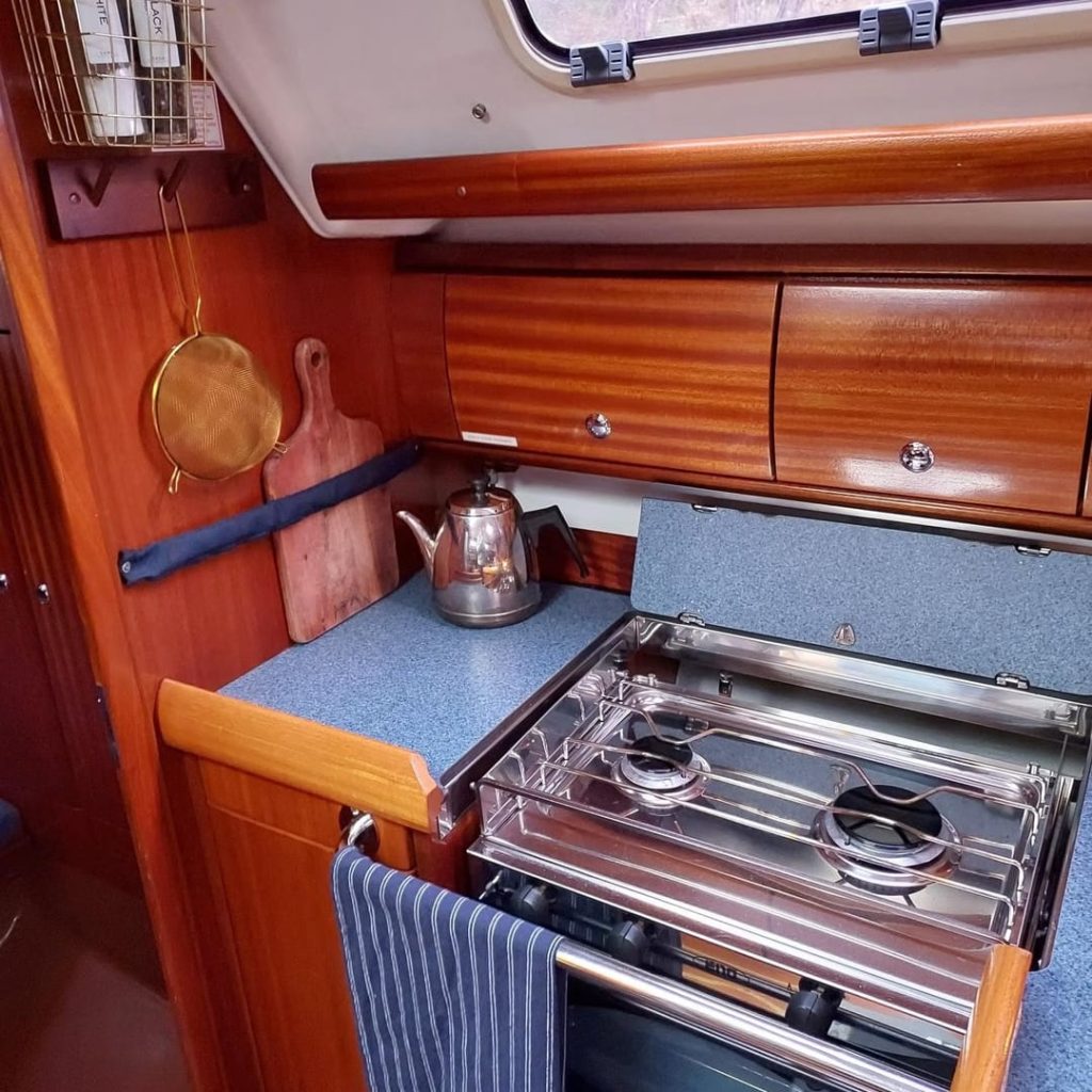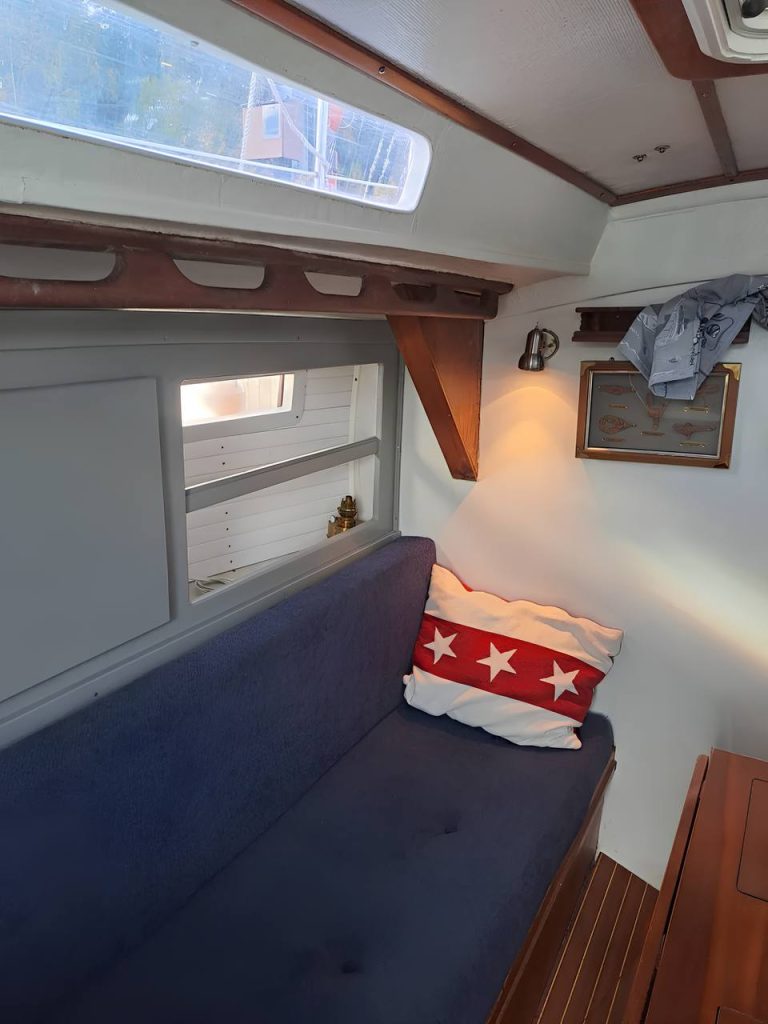 The layout is practical for a small crew or family. Five berths: two in the forepeak, two in the saloon, and one quarter berth aft. The classic interior, with quality woodwork and new LED lighting, feels cozy and bright.