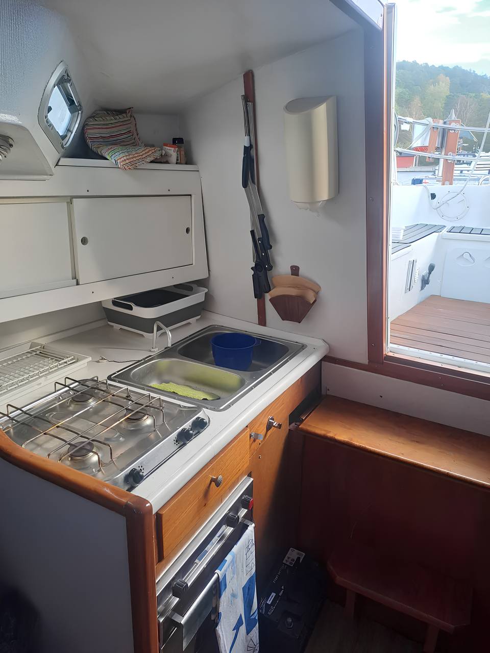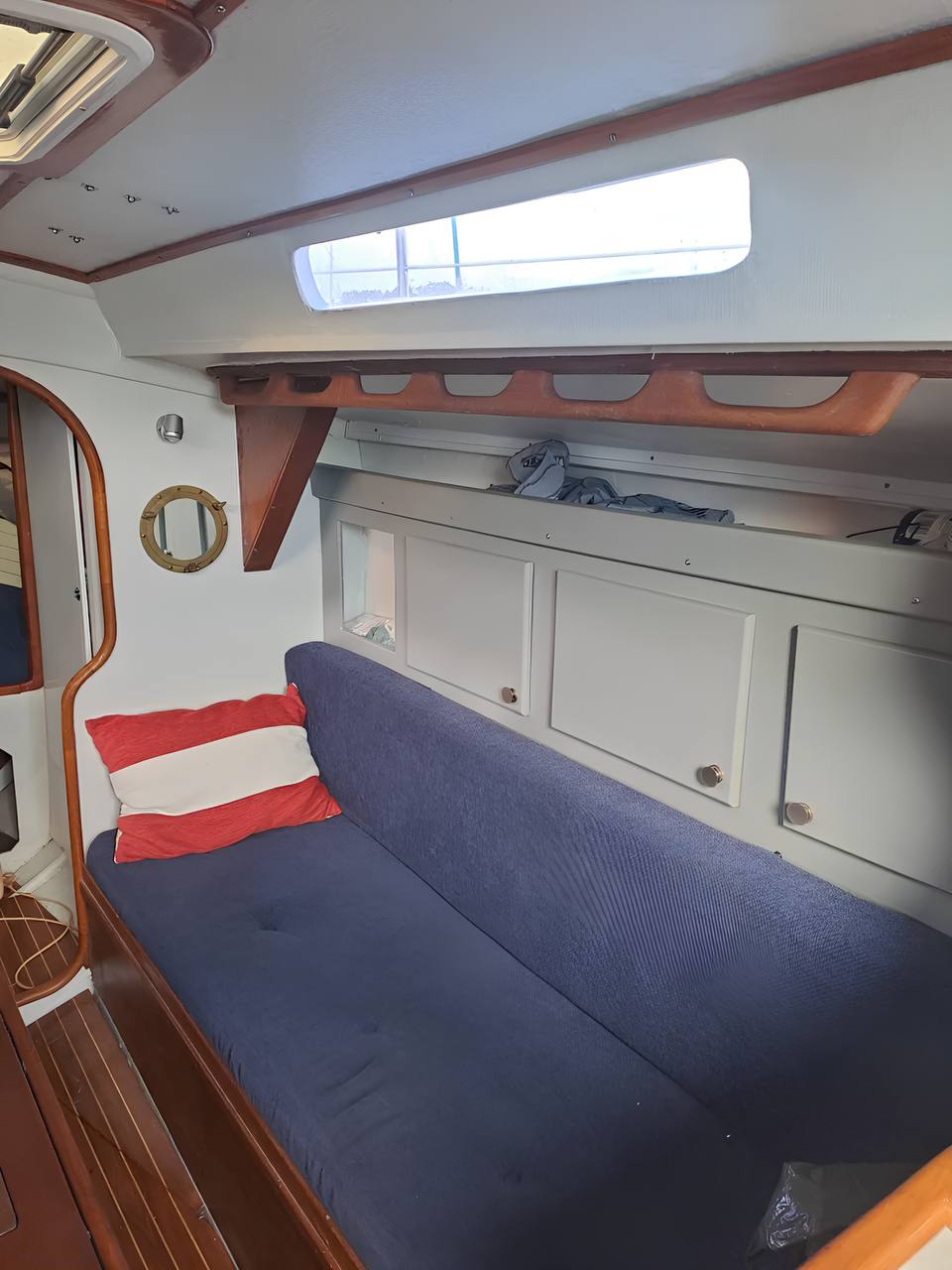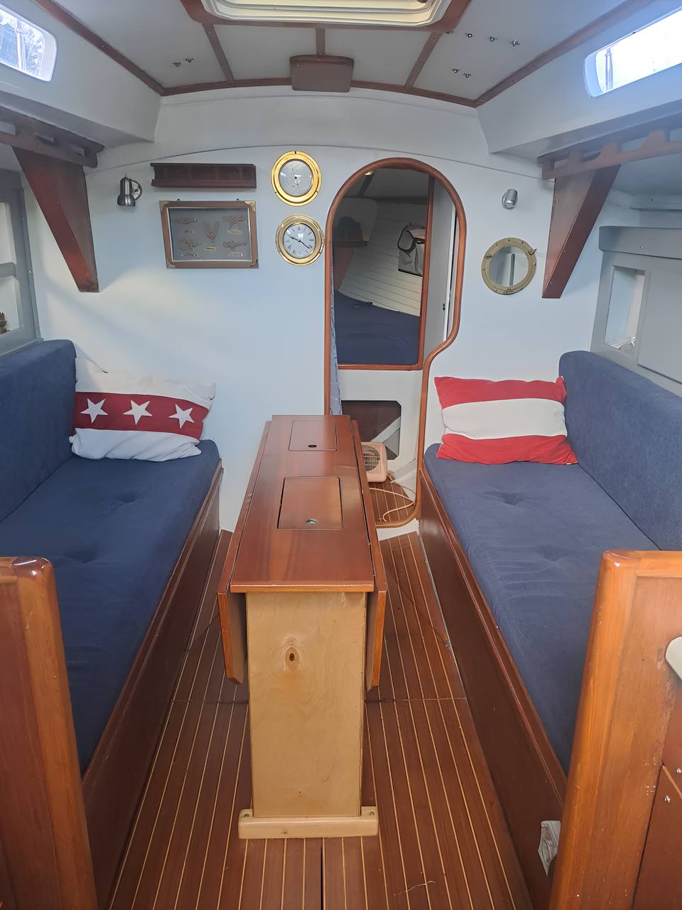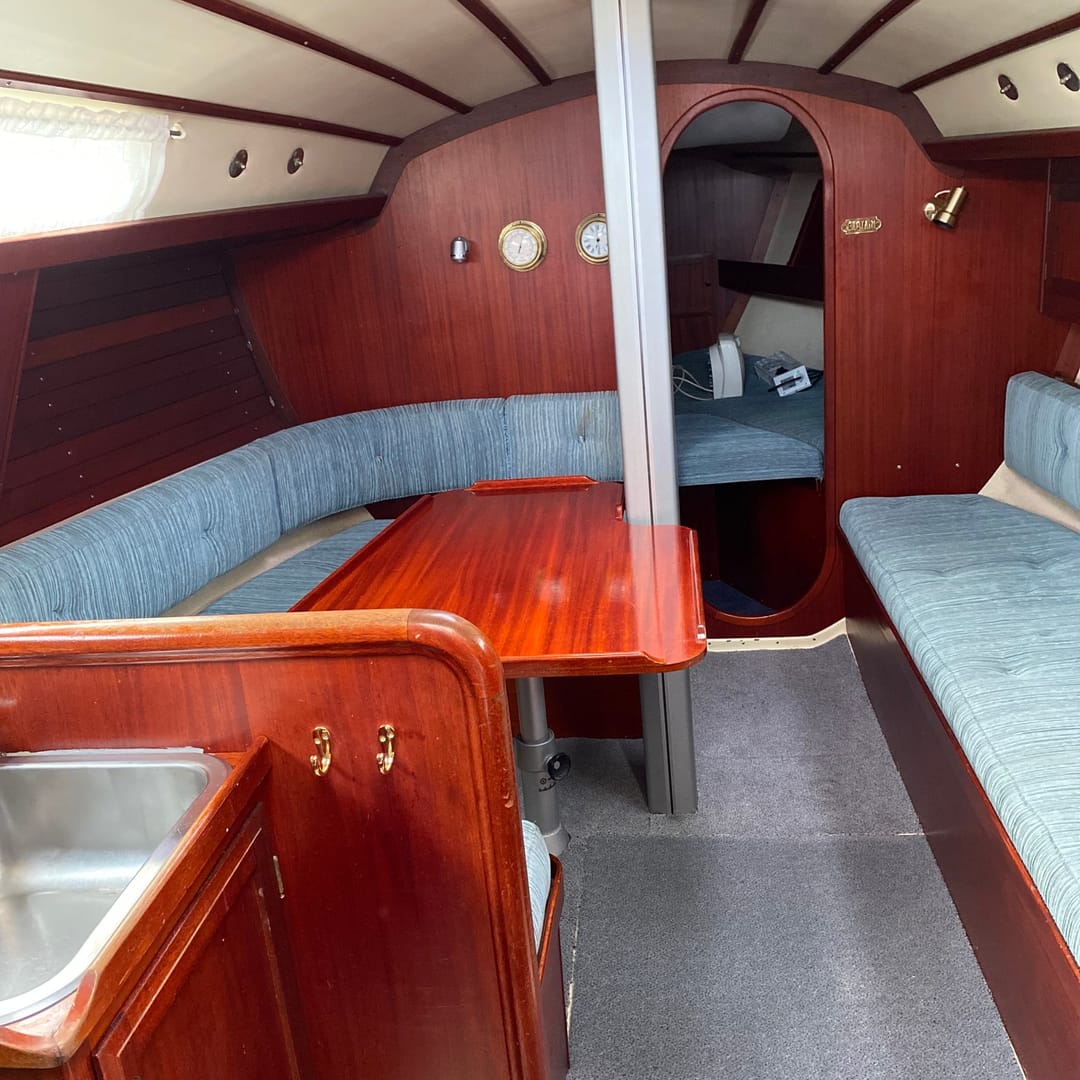 The layout is practical for a small crew or family. Five berths: two in the forepeak, two in the saloon, and one quarter berth aft. The classic interior, with quality woodwork and new LED lighting, feels cozy and bright.