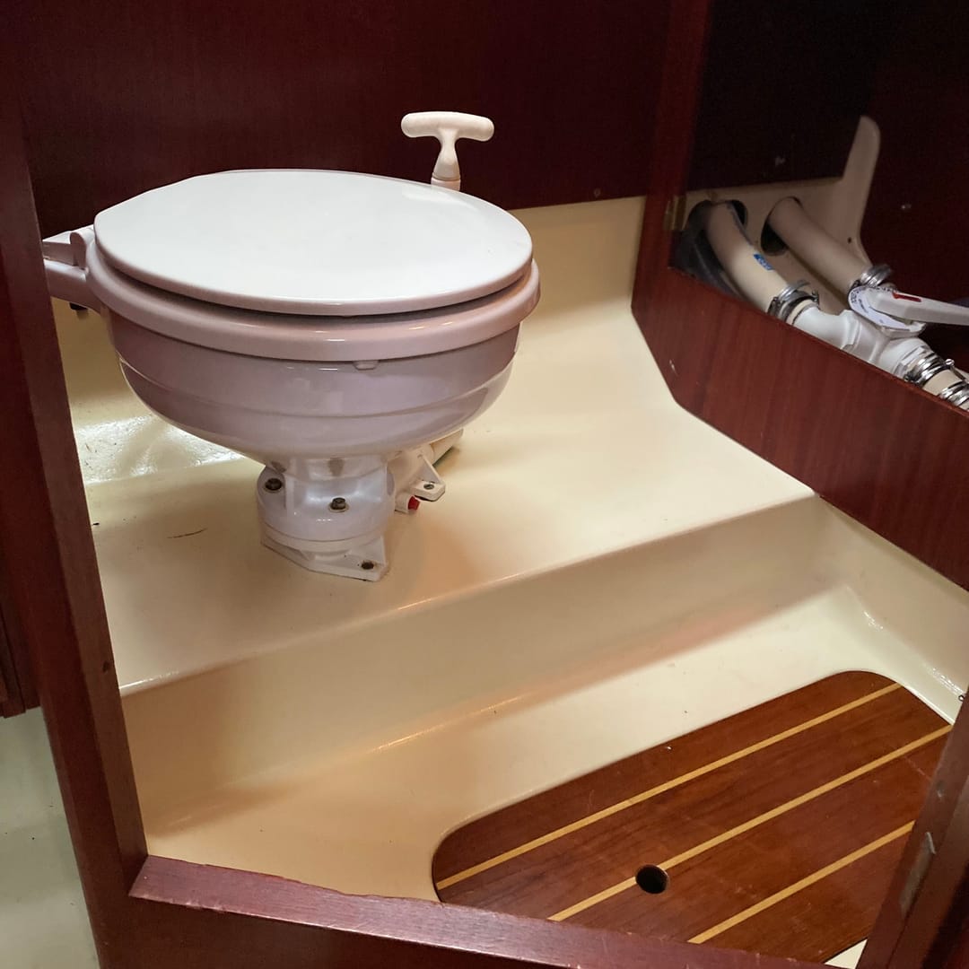 🍴 Comfort: 2-burner gas stove, fridge with freezer, toilet with holding tank, 100-liter water, diesel heater, swim platform with ladder