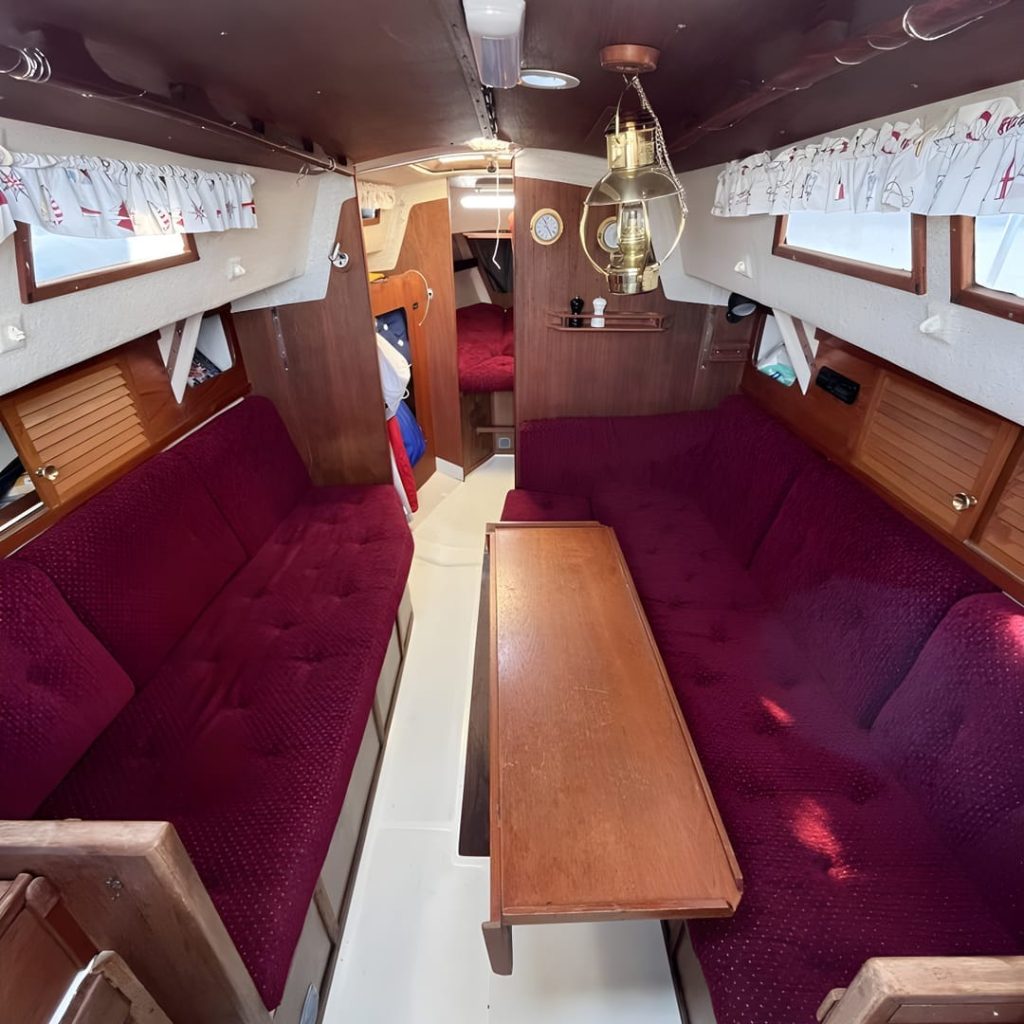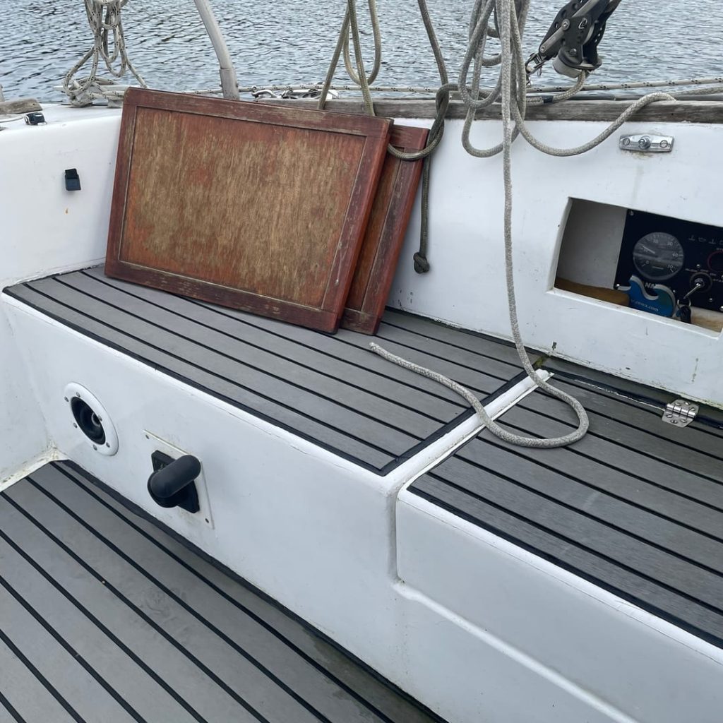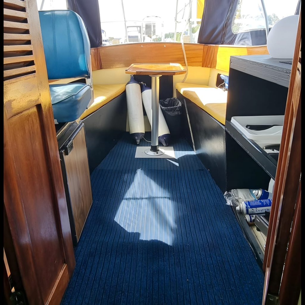 🍴 Comfort: cockpit canopy, portable fridge, gas stove with oven, moveable table, swim platform, five berths, teak interior, CD/radio with speakers