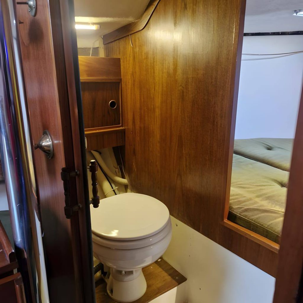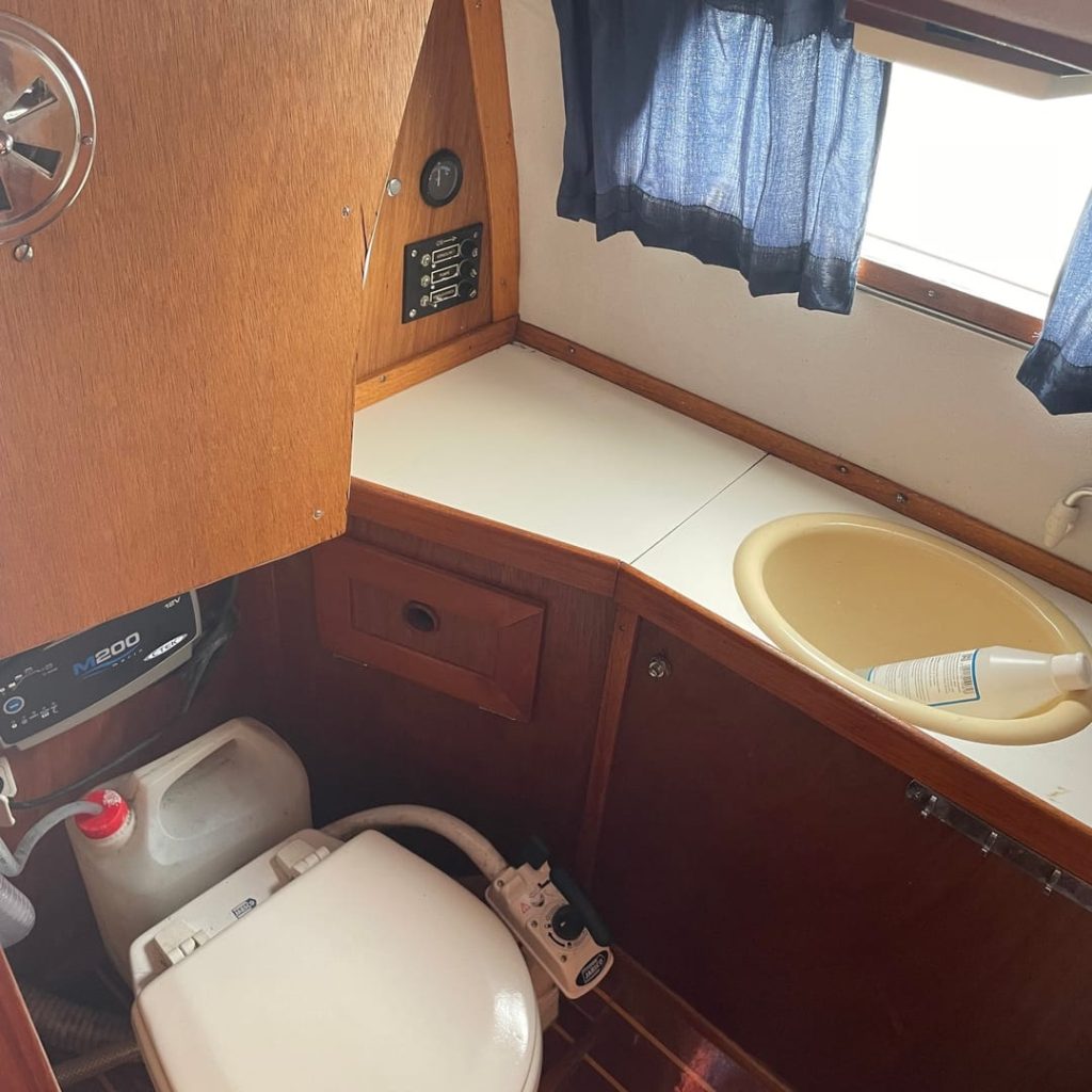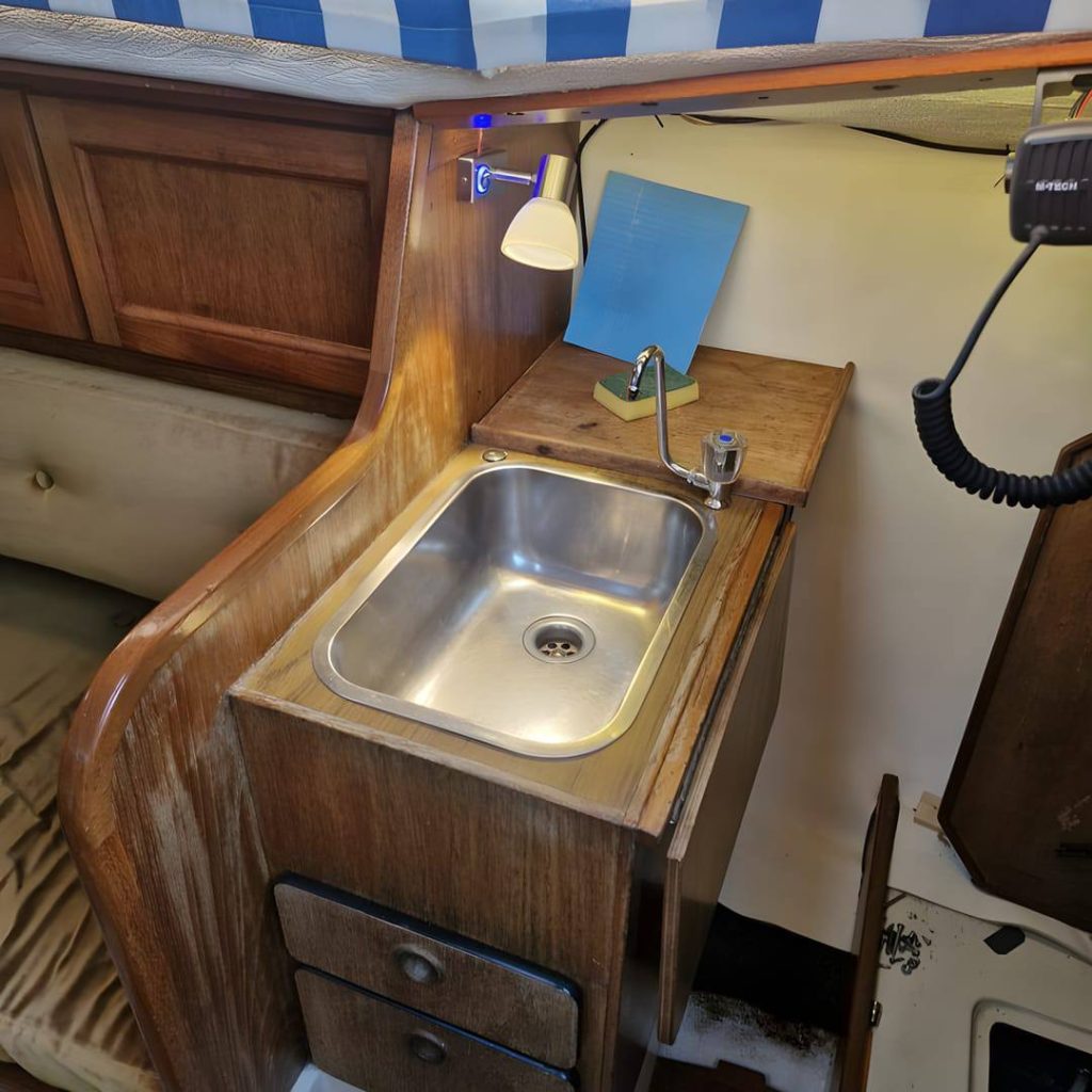🍴 Comfort: cockpit canopy, portable fridge, gas stove with oven, moveable table, swim platform, five berths, teak interior, CD/radio with speakers