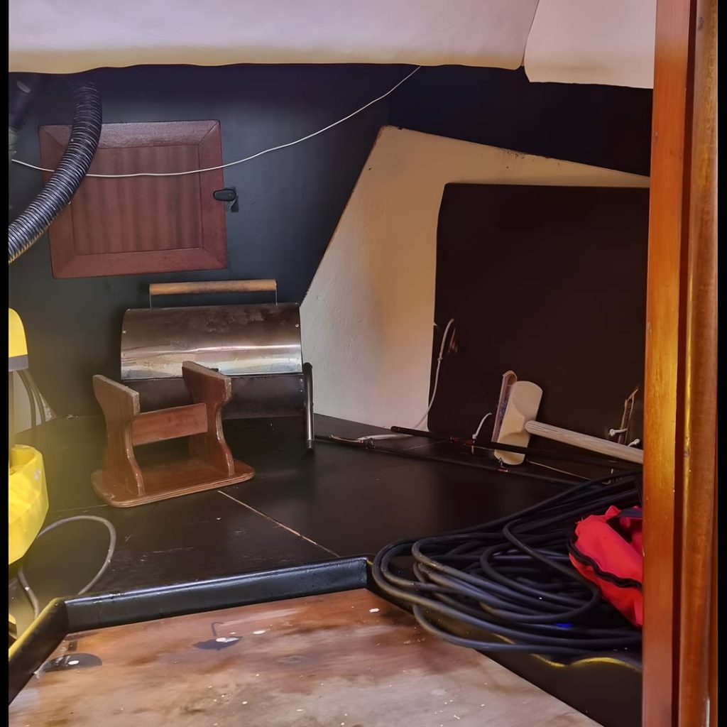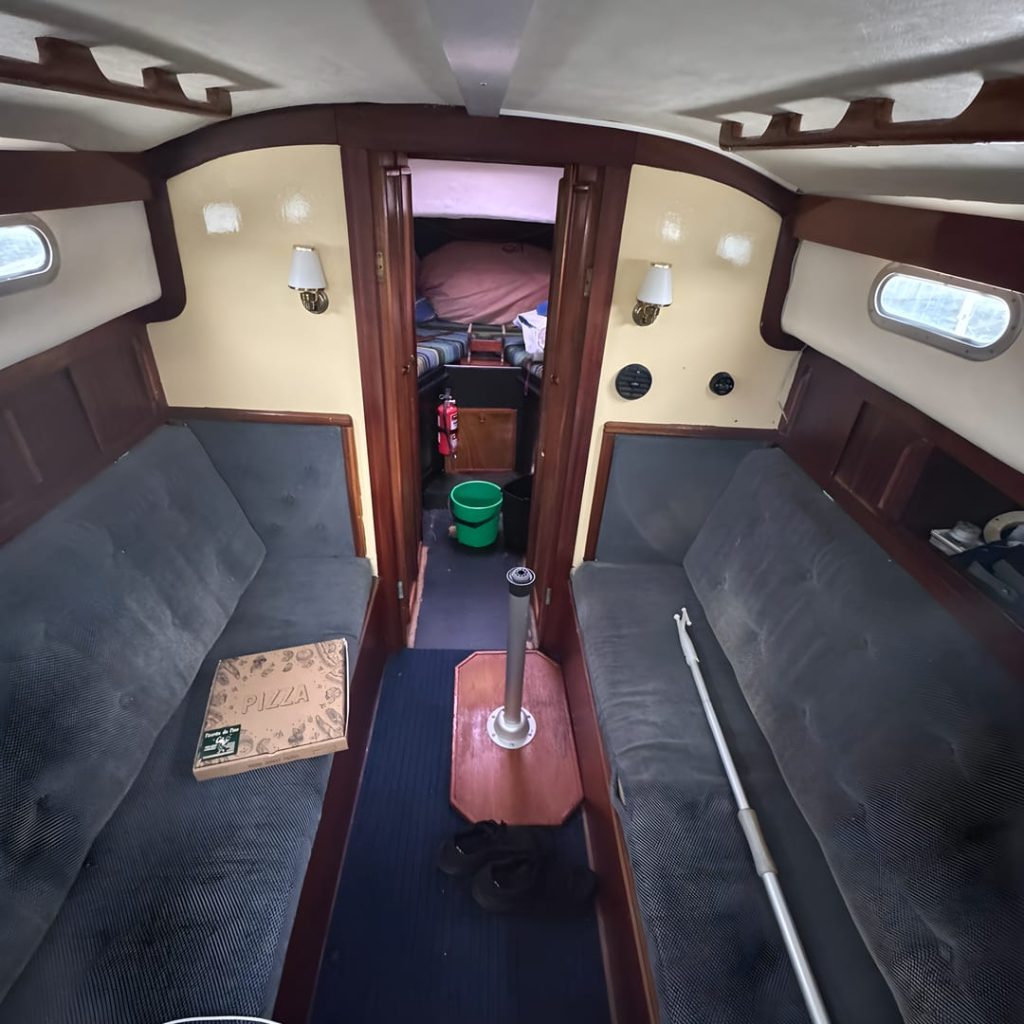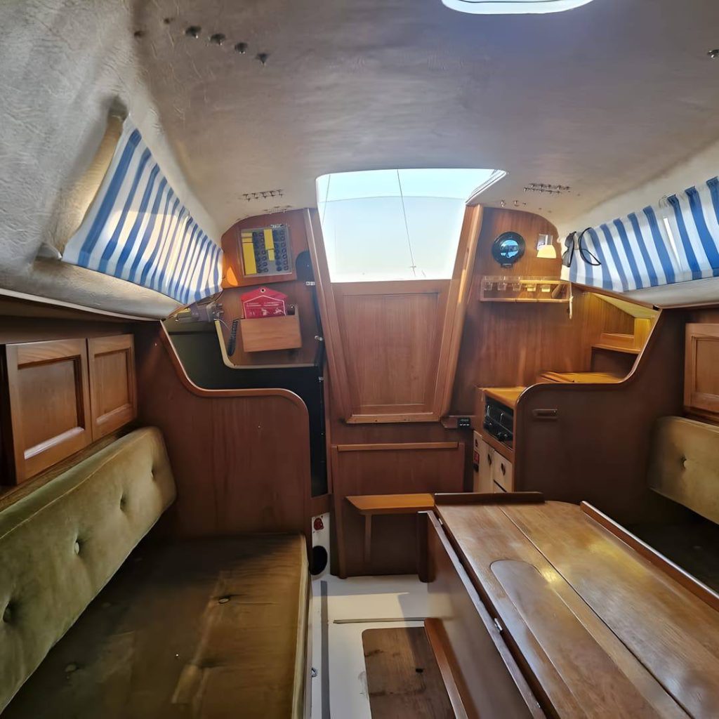 The teak interior is renovated and fitted with new shelves. The layout includes four full-length berths and a fifth for a child. The saloon is practical for both relaxing and dining.