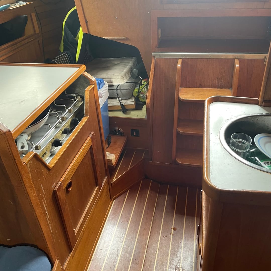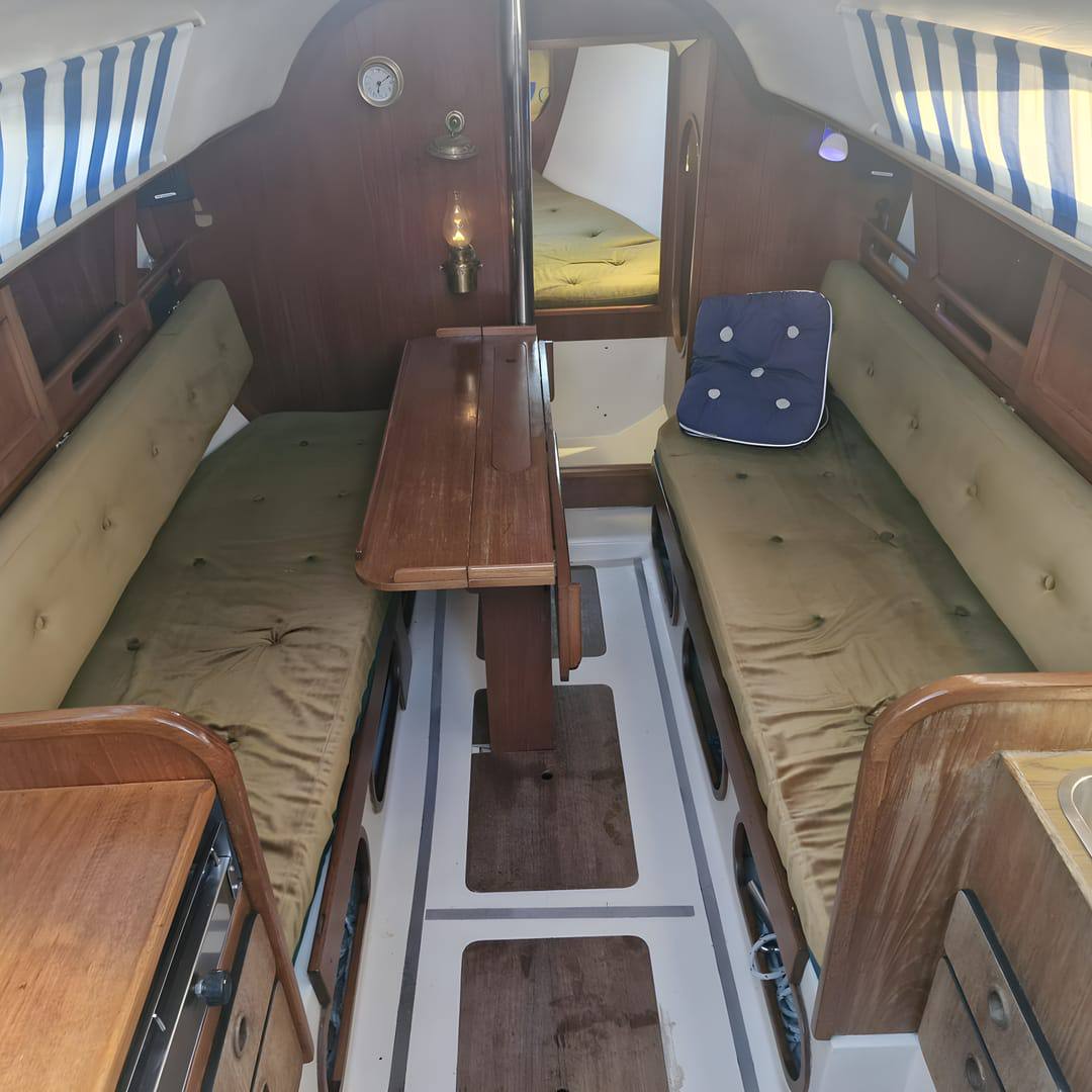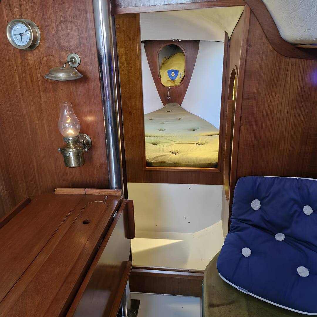 The teak interior is renovated and fitted with new shelves. The layout includes four full-length berths and a fifth for a child. The saloon is practical for both relaxing and dining.