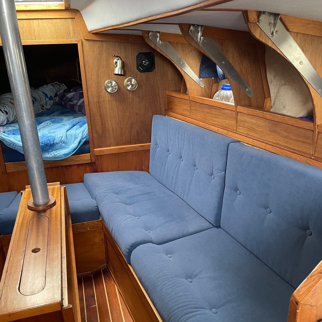 🍴 Comfort: cockpit canopy, portable fridge, gas stove with oven, moveable table, swim platform, five berths, teak interior, CD/radio with speakers