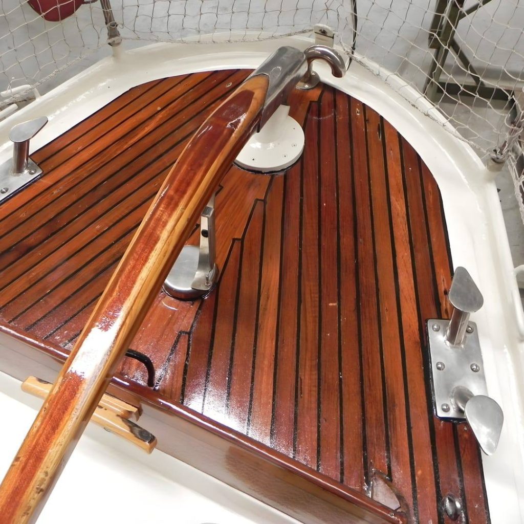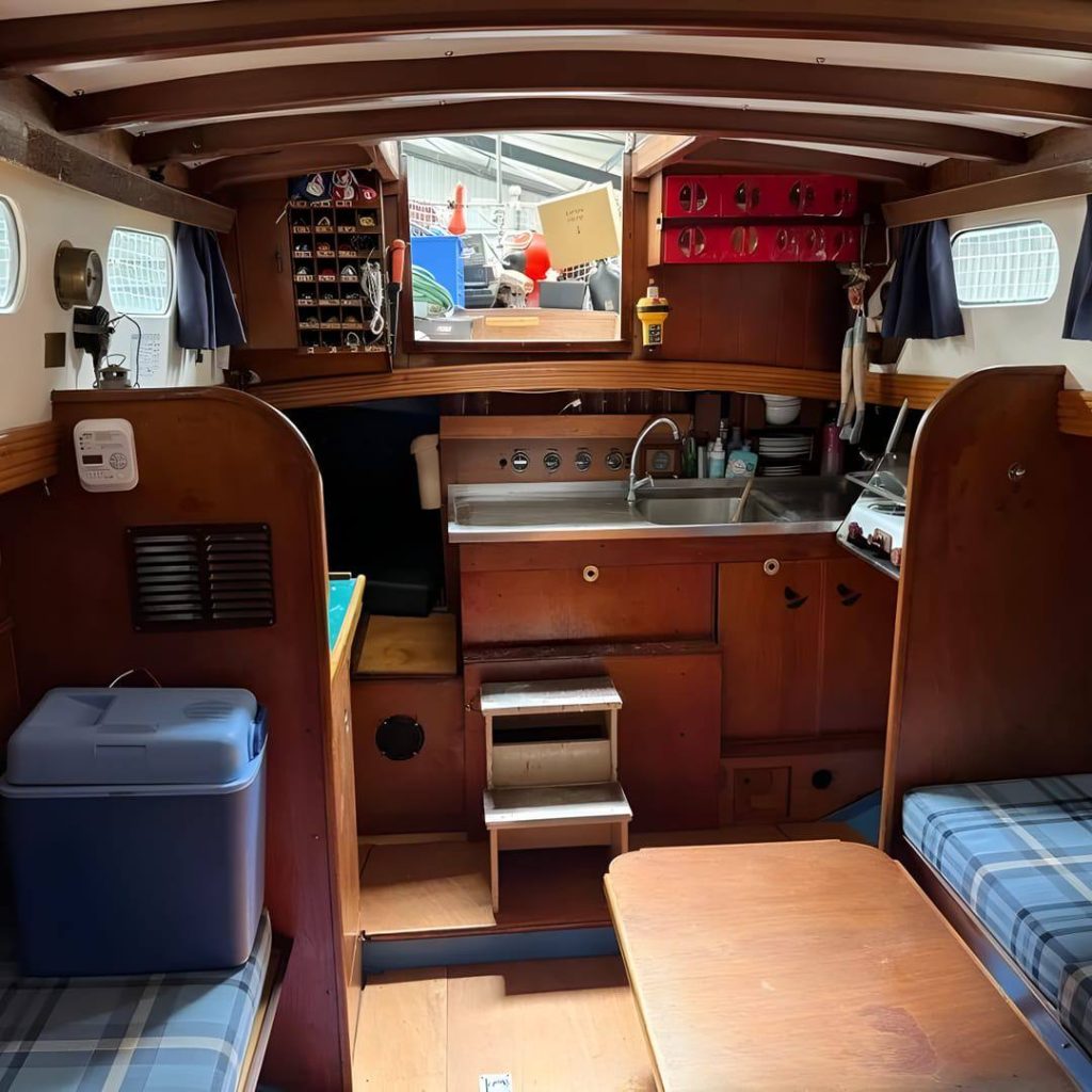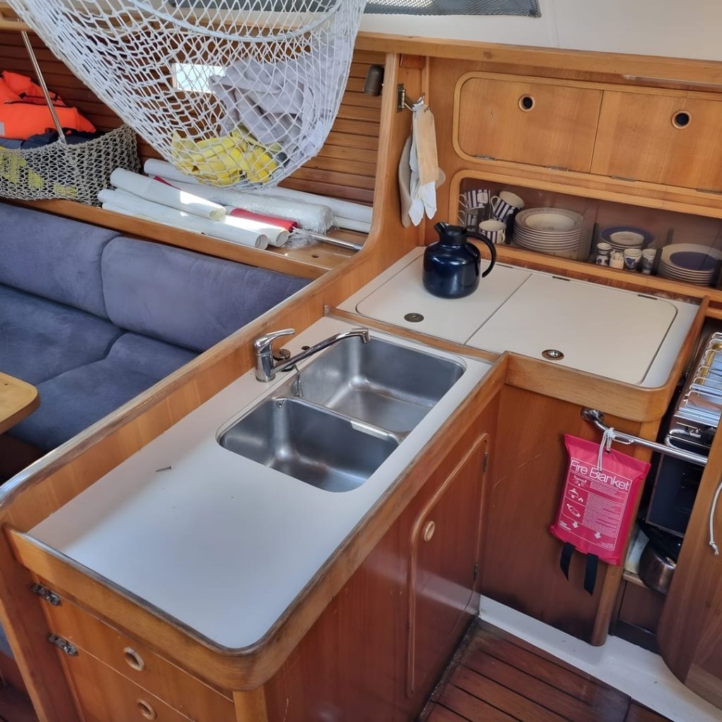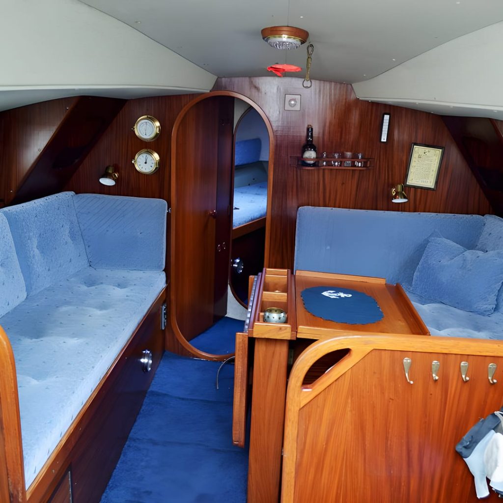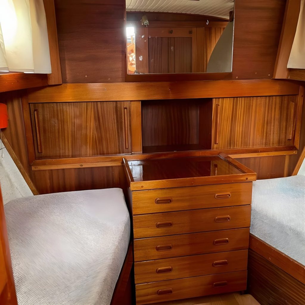This yacht features a deep protected cockpit with classic teak benches and a solid sprayhood. The interior is finished in warm teak, with a practical galley and a large saloon that lets you relax after long passages.