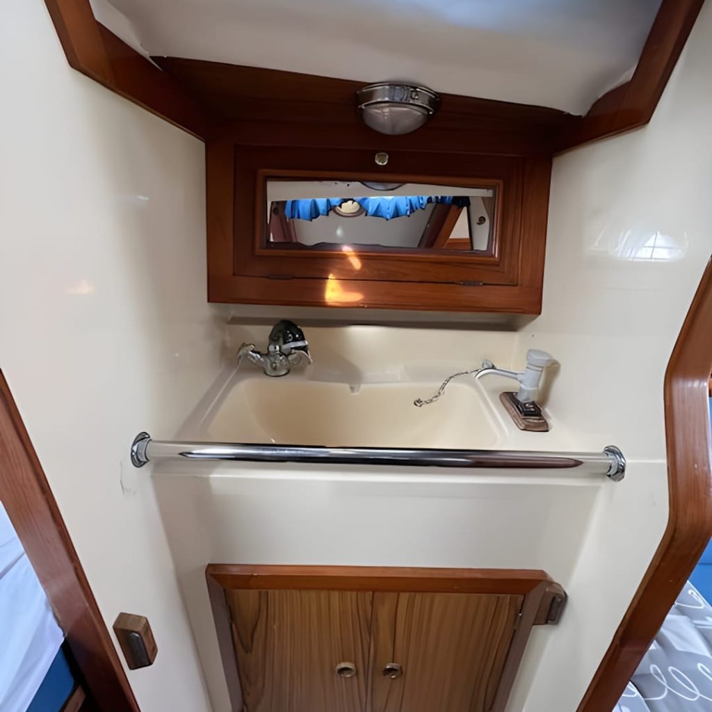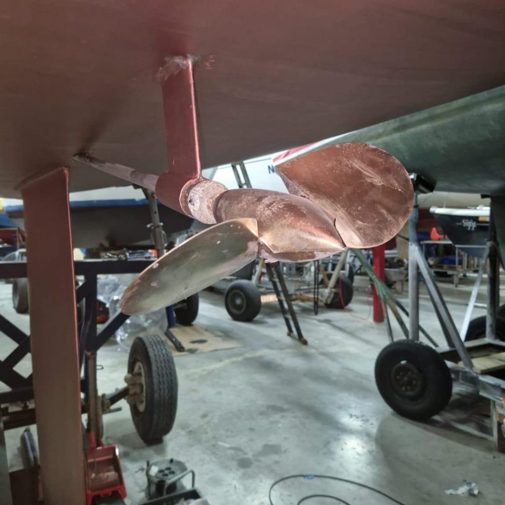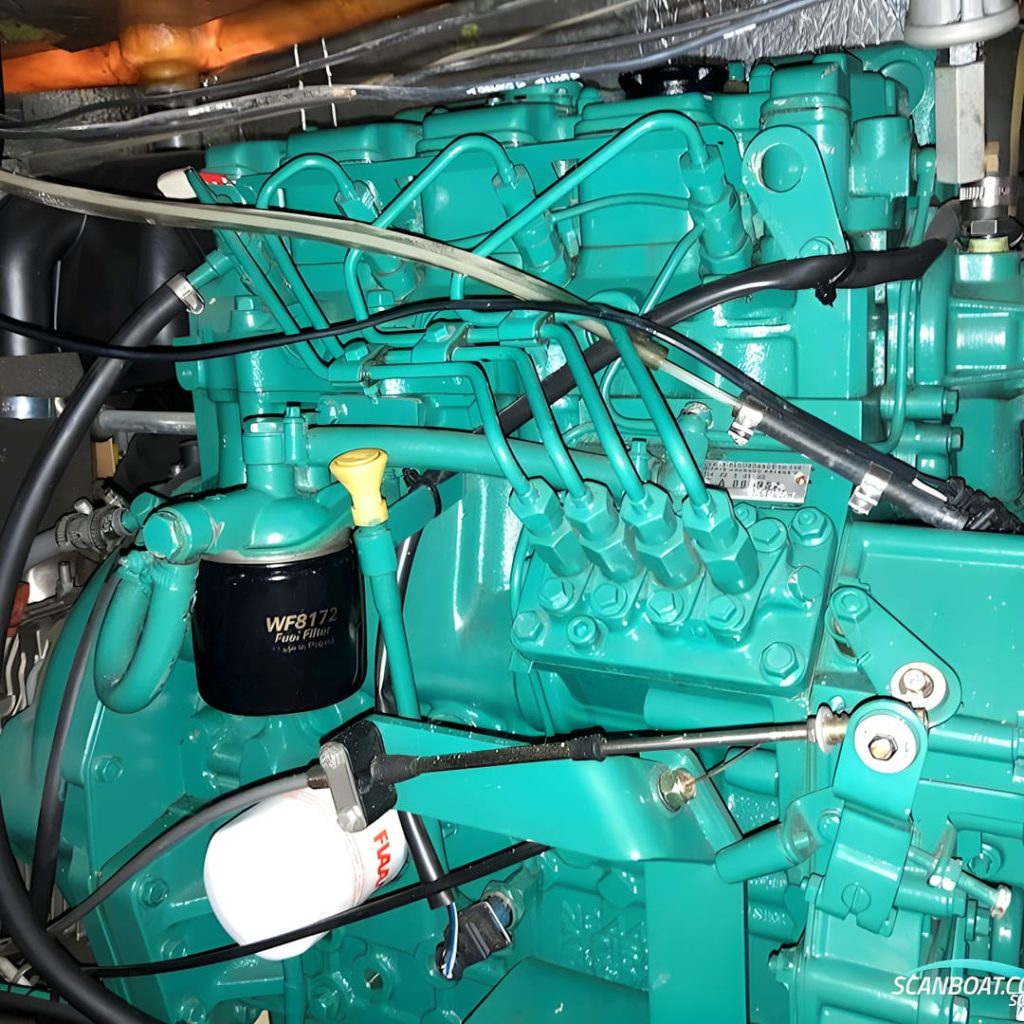 The Yanmar 2GM20 engine has regular oil and filter changes. A new air filter and impeller are scheduled for 2025. The folding propeller helps with maneuvering in tight harbors.