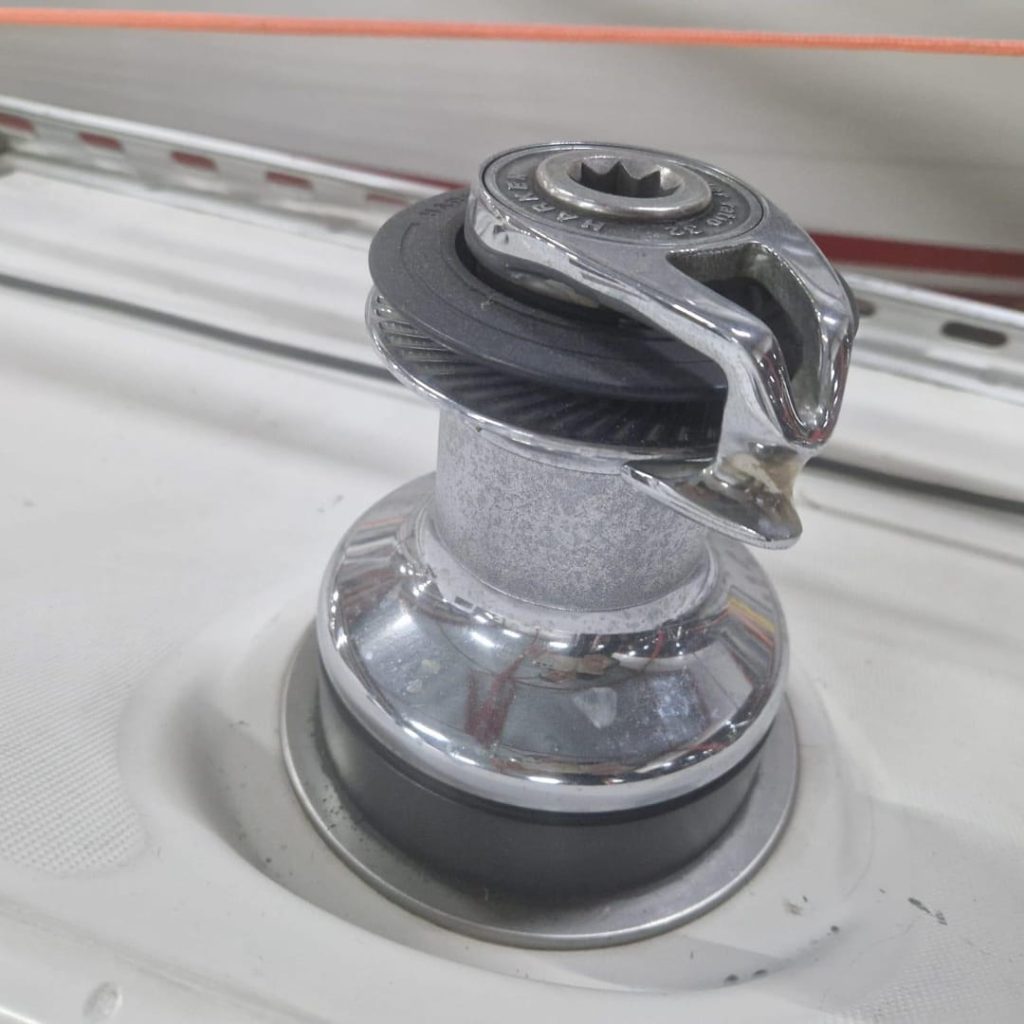 The boat is equipped with a full set of sails, including regatta main, genoa, jib, storm jib, and spinnaker. The aluminum mast, boom, and spinnaker pole are paired with Dyneema backstays and high-quality Lewmar winches for reliable handling.