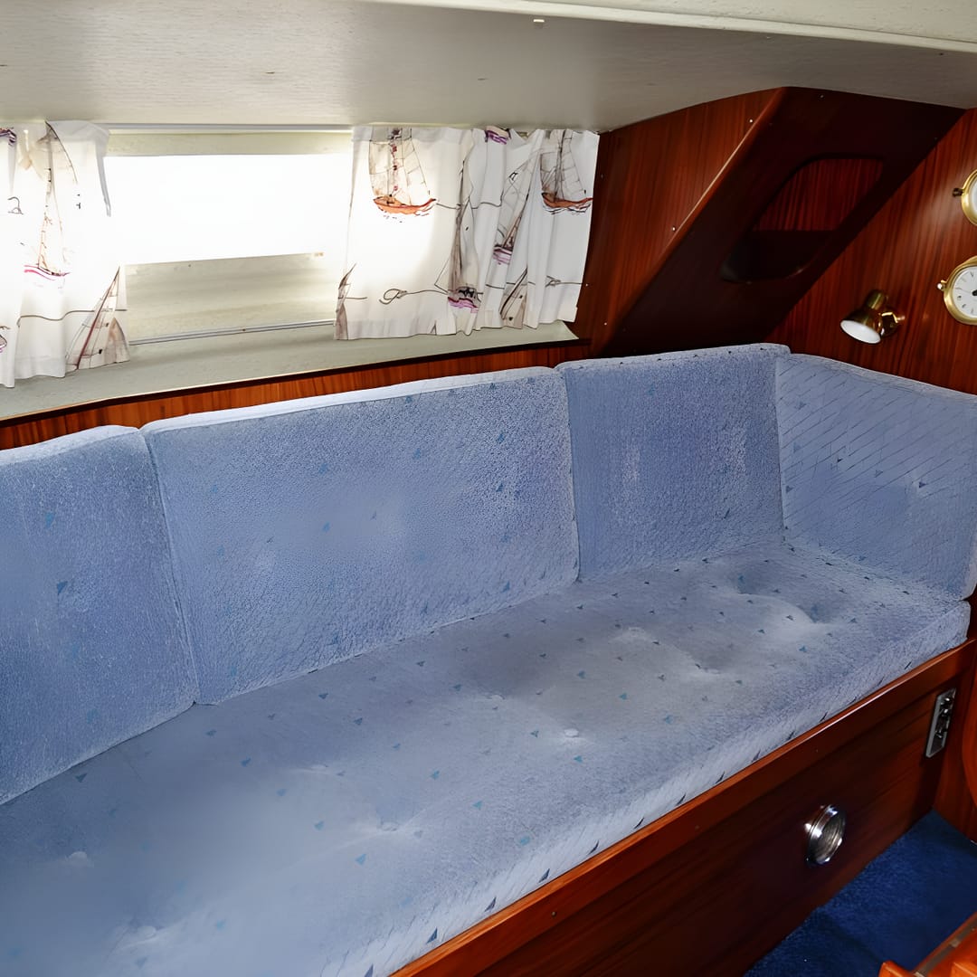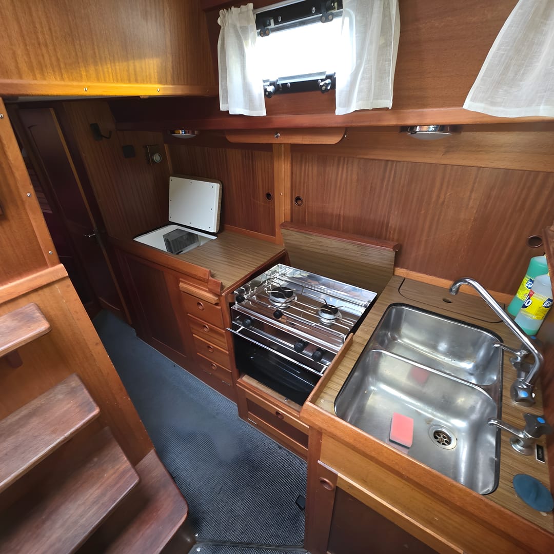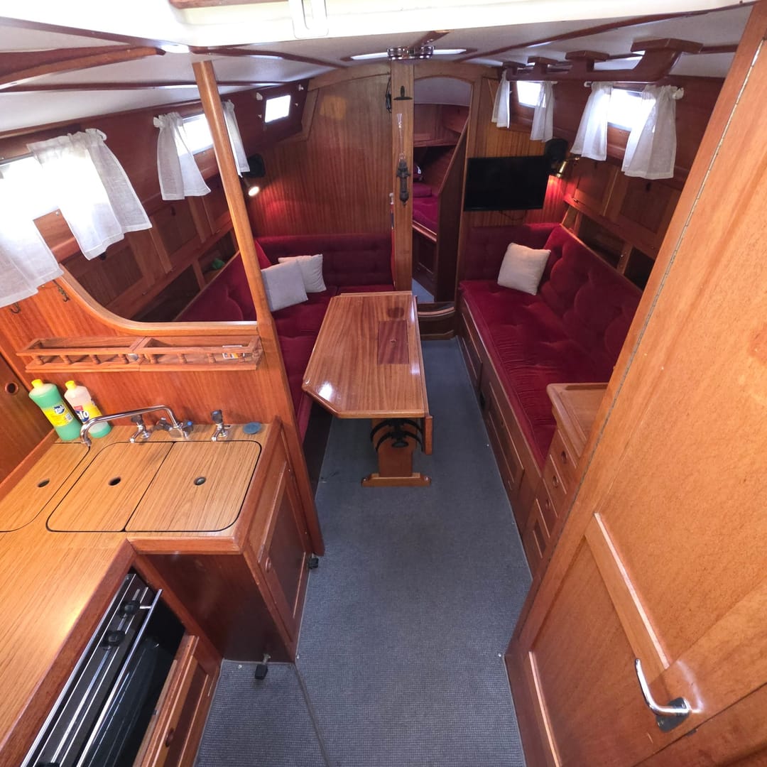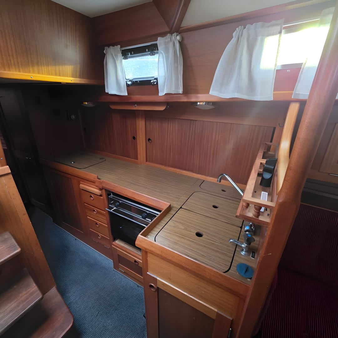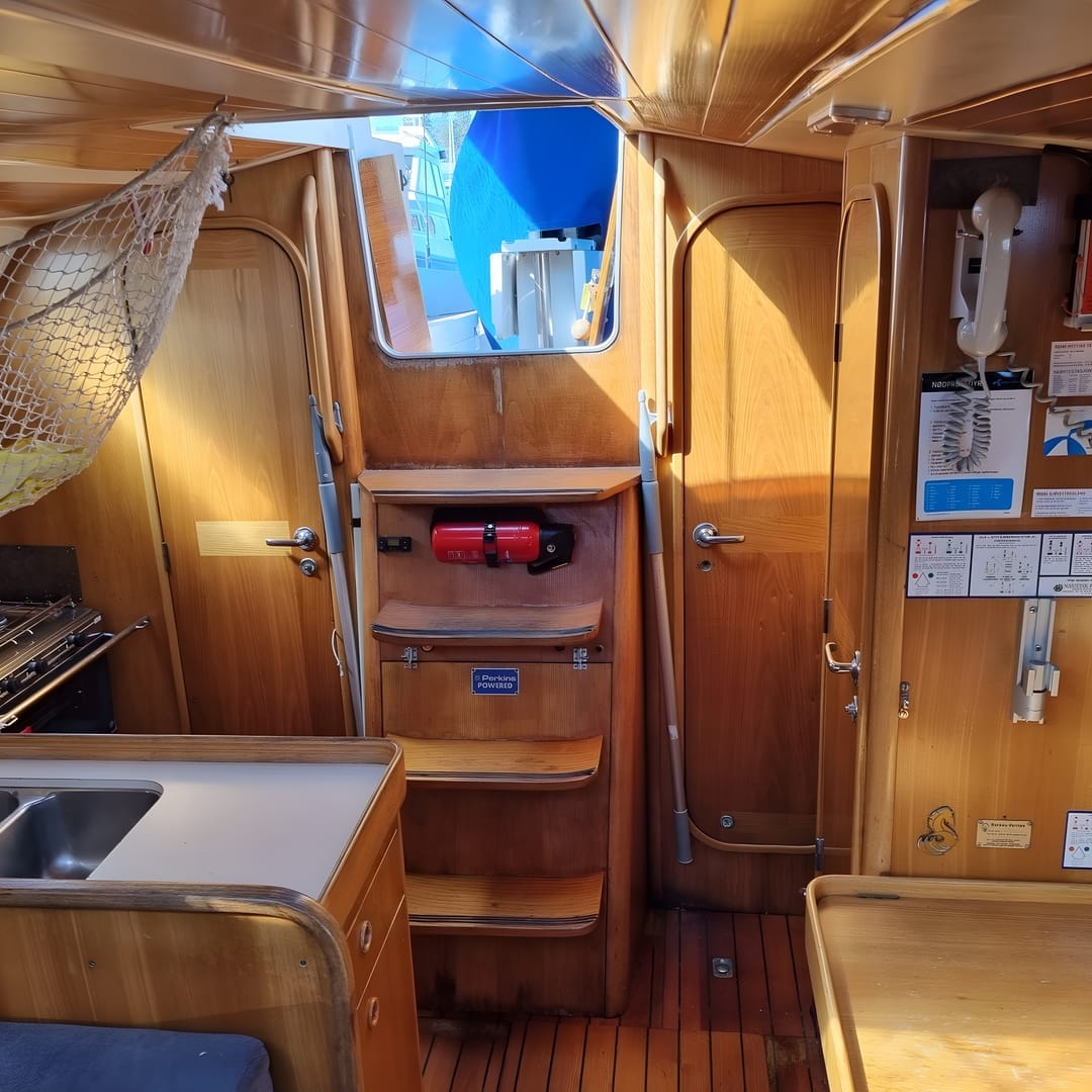 This yacht features a deep protected cockpit with classic teak benches and a solid sprayhood. The interior is finished in warm teak, with a practical galley and a large saloon that lets you relax after long passages.
