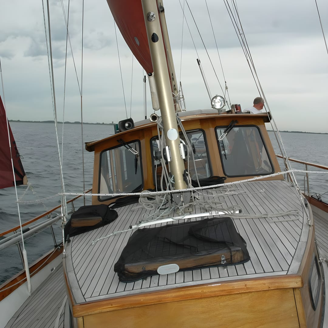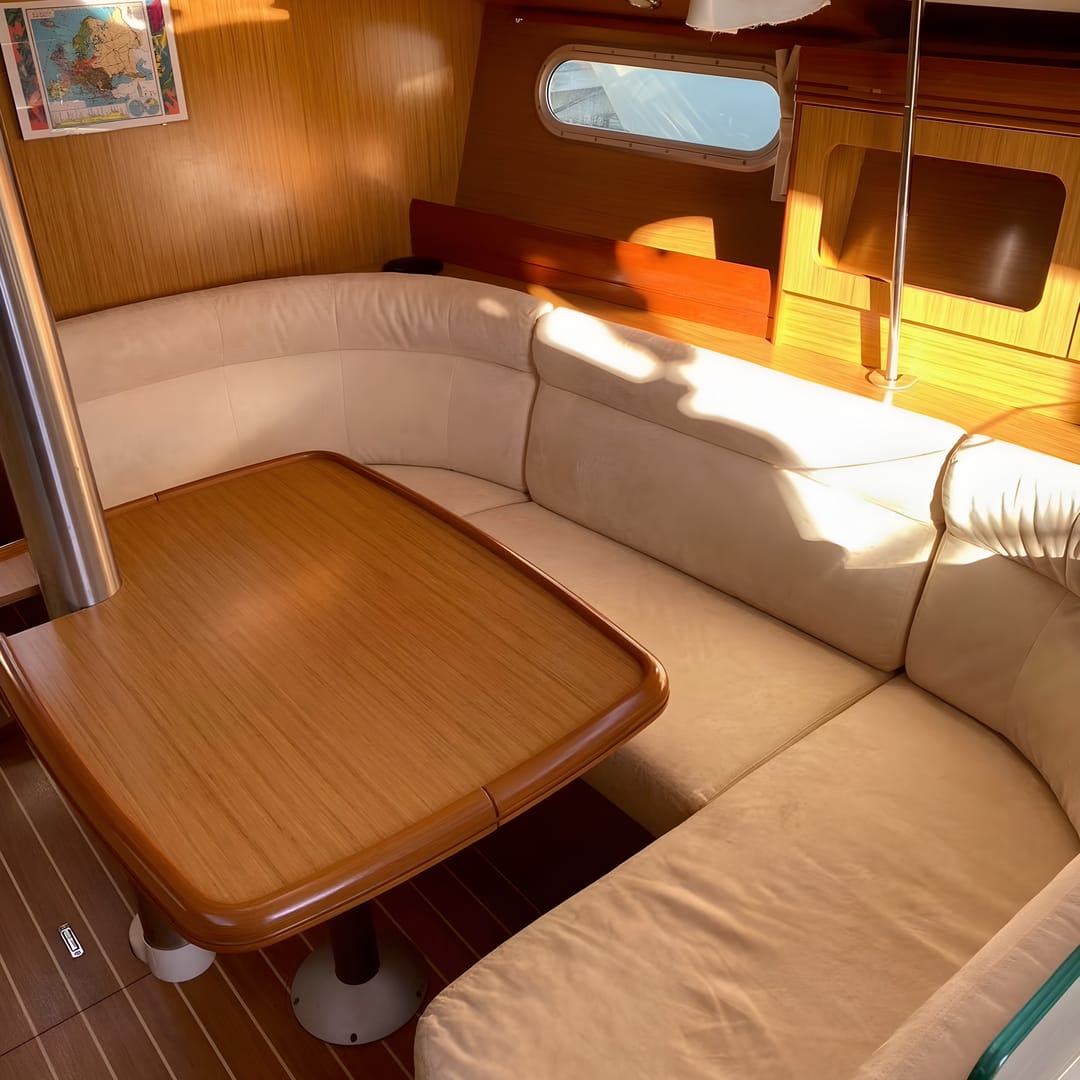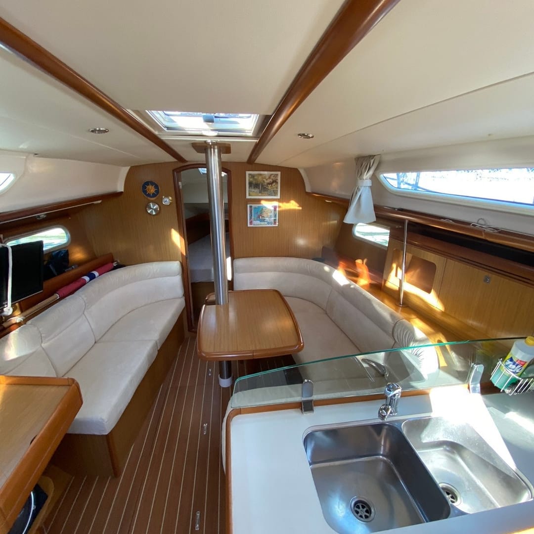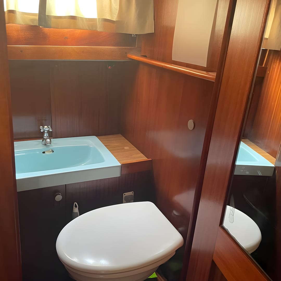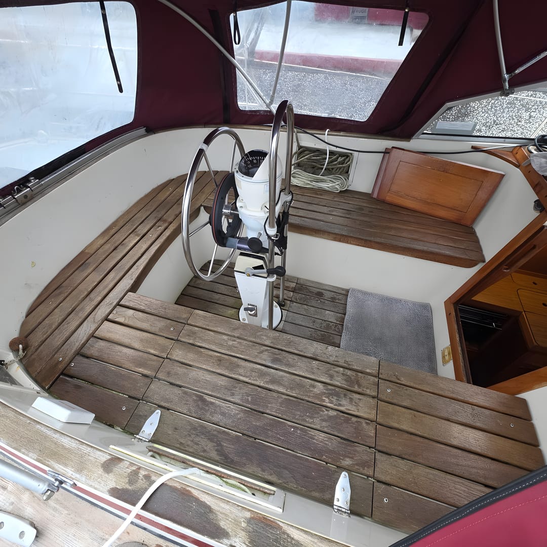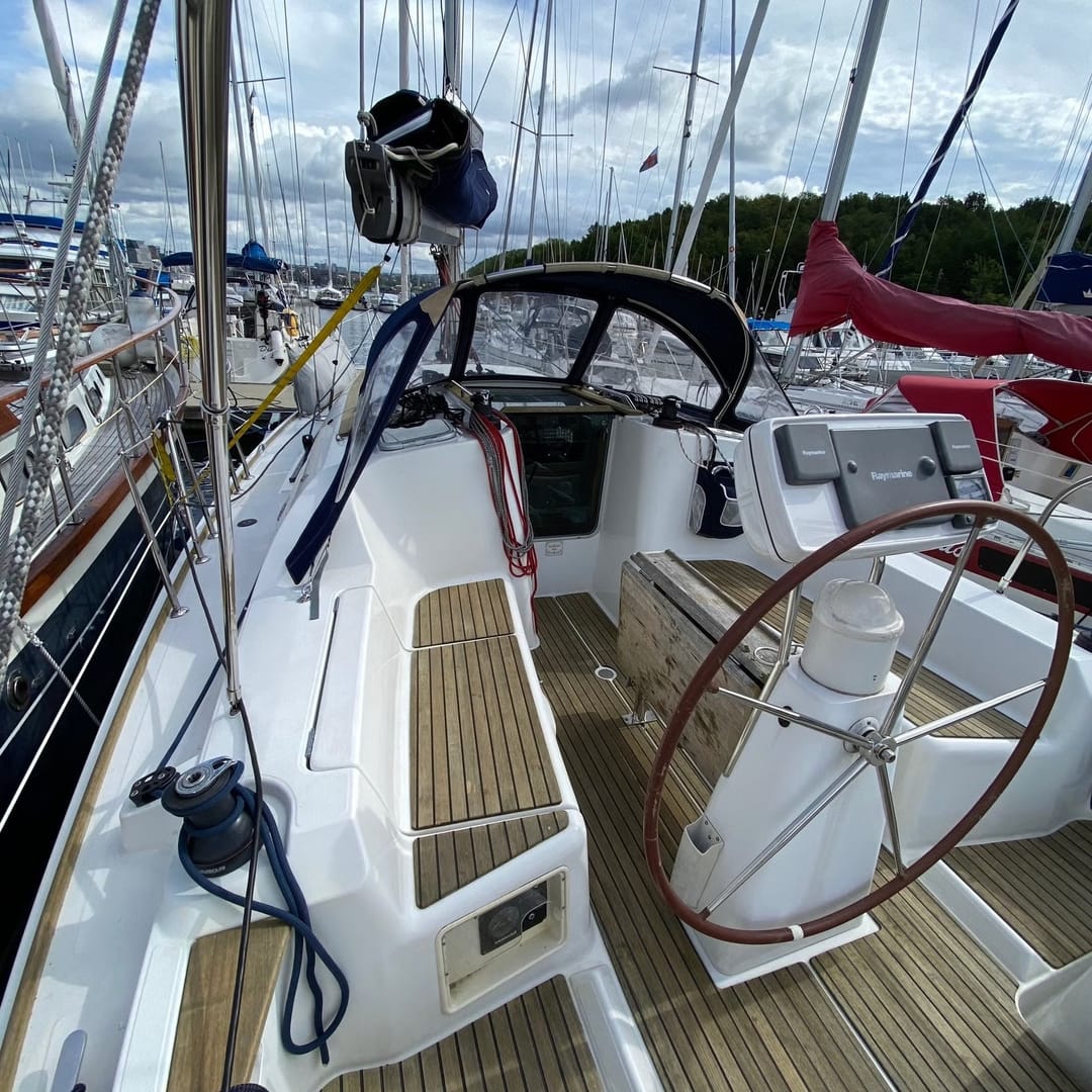 This yacht features a deep protected cockpit with classic teak benches and a solid sprayhood. The interior is finished in warm teak, with a practical galley and a large saloon that lets you relax after long passages.