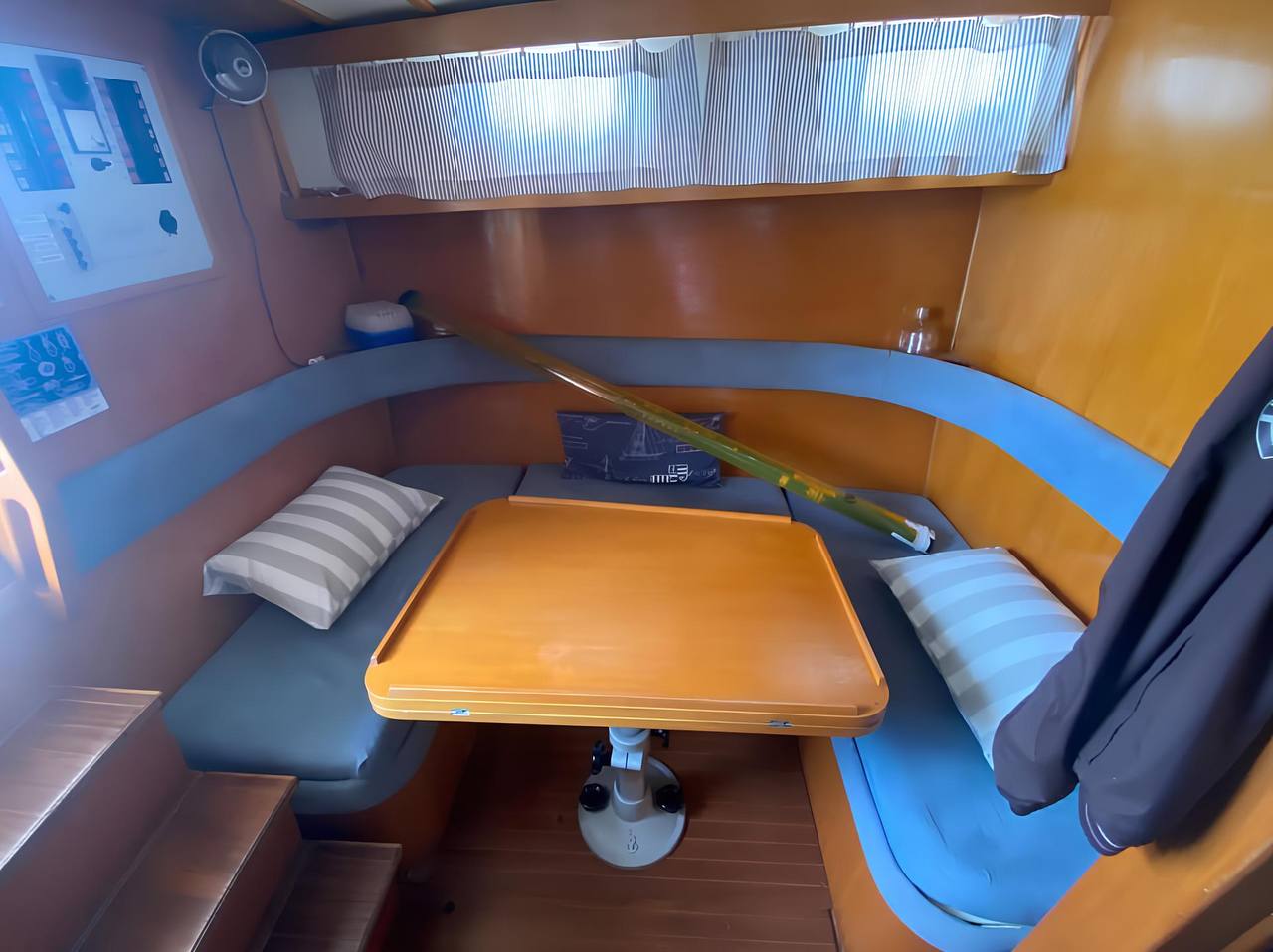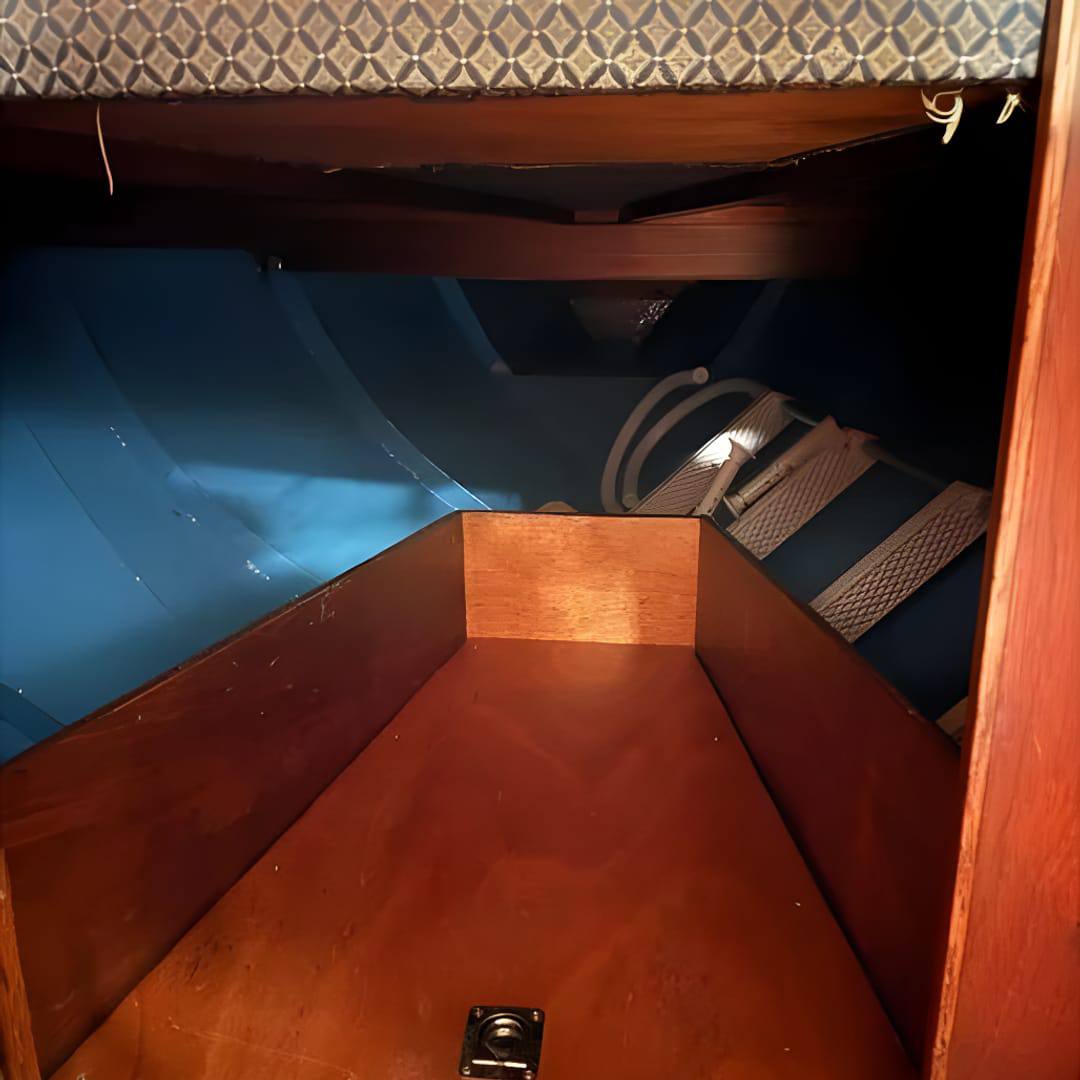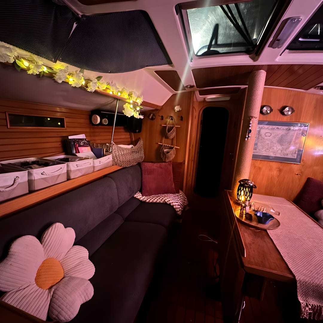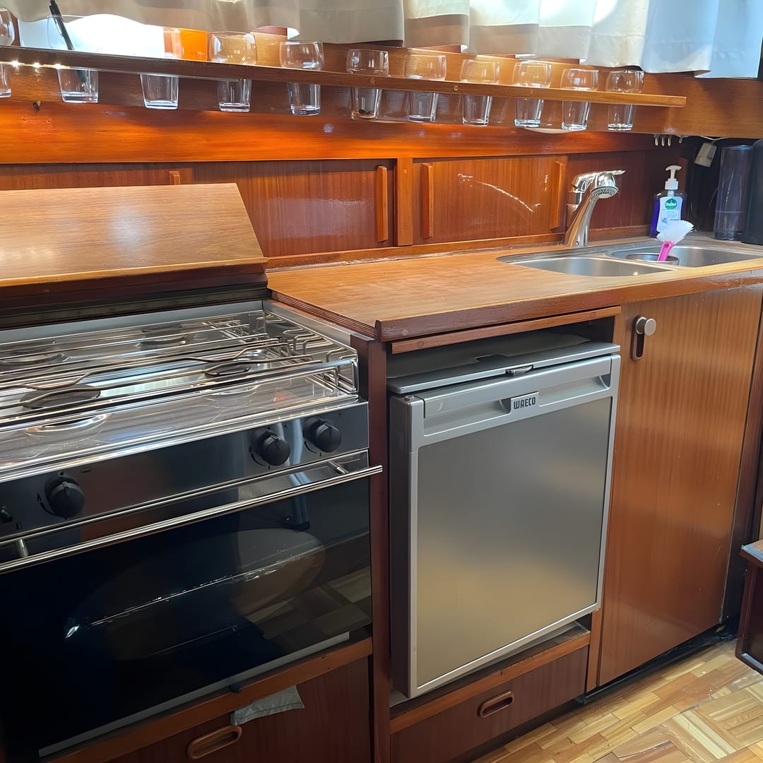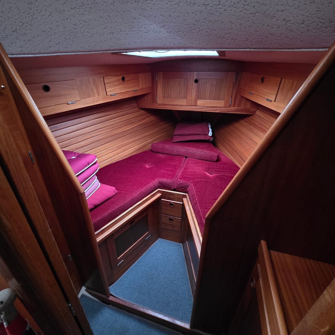 This yacht features a deep protected cockpit with classic teak benches and a solid sprayhood. The interior is finished in warm teak, with a practical galley and a large saloon that lets you relax after long passages.