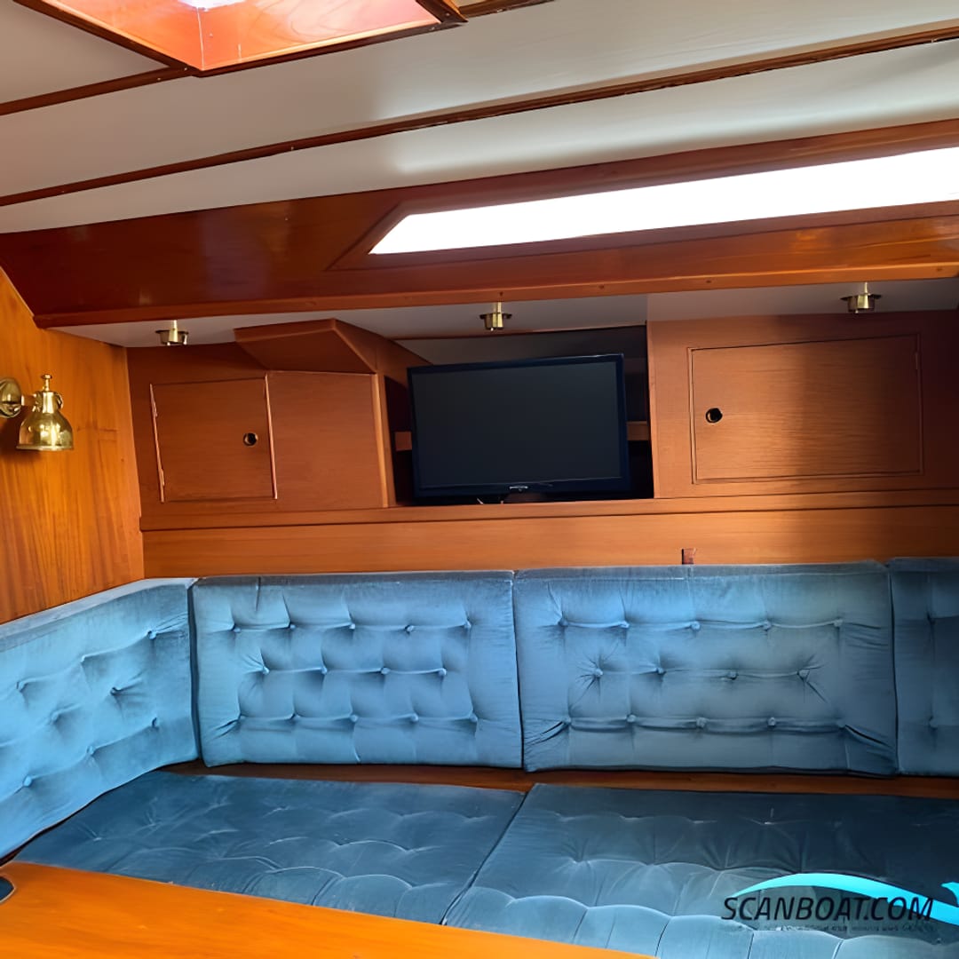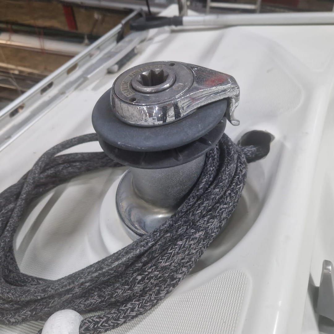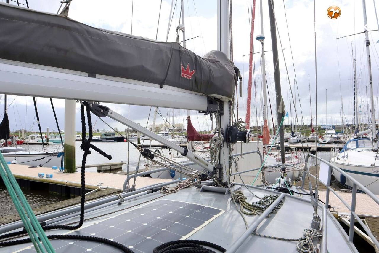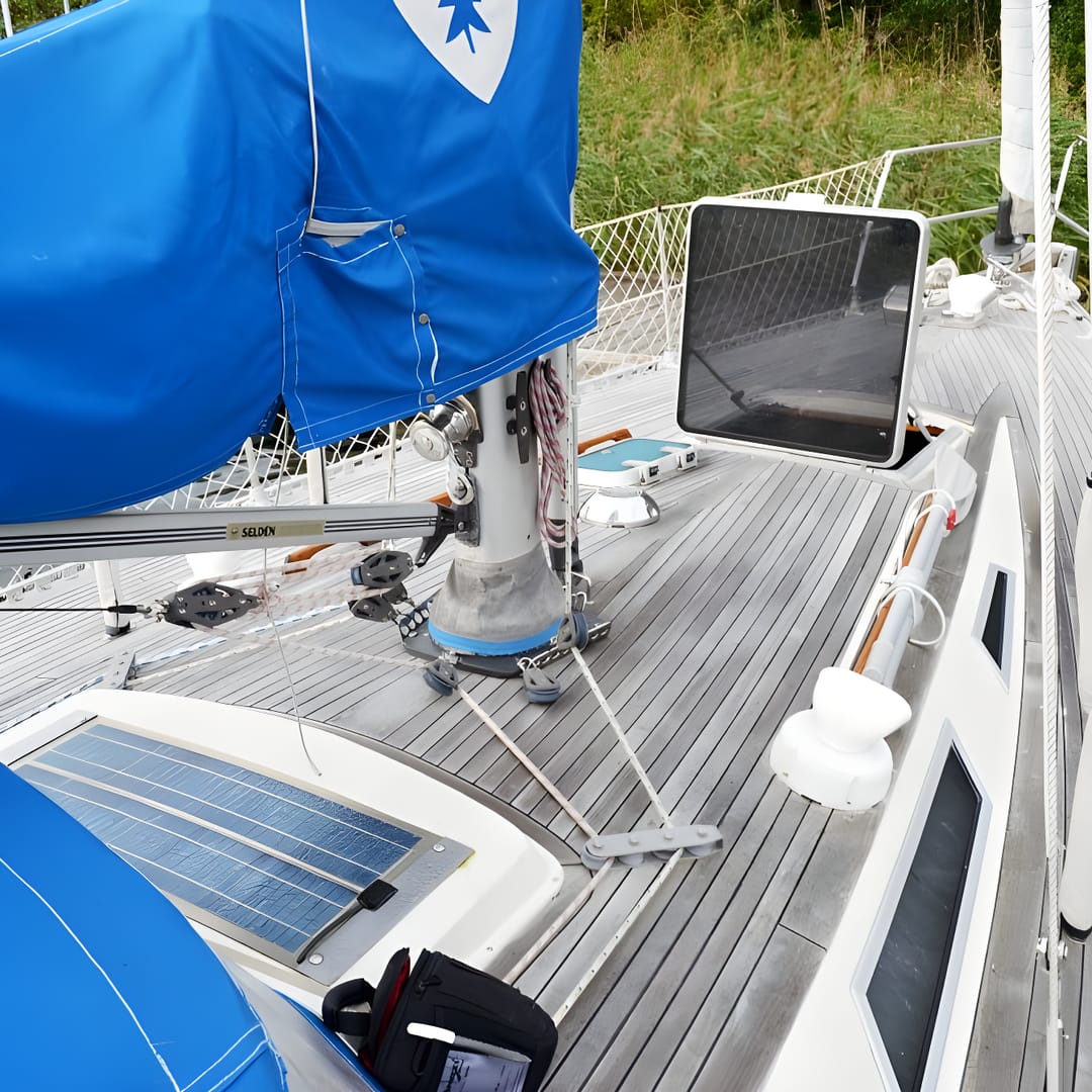 The boat is equipped with a full set of sails, including regatta main, genoa, jib, storm jib, and spinnaker. The aluminum mast, boom, and spinnaker pole are paired with Dyneema backstays and high-quality Lewmar winches for reliable handling.