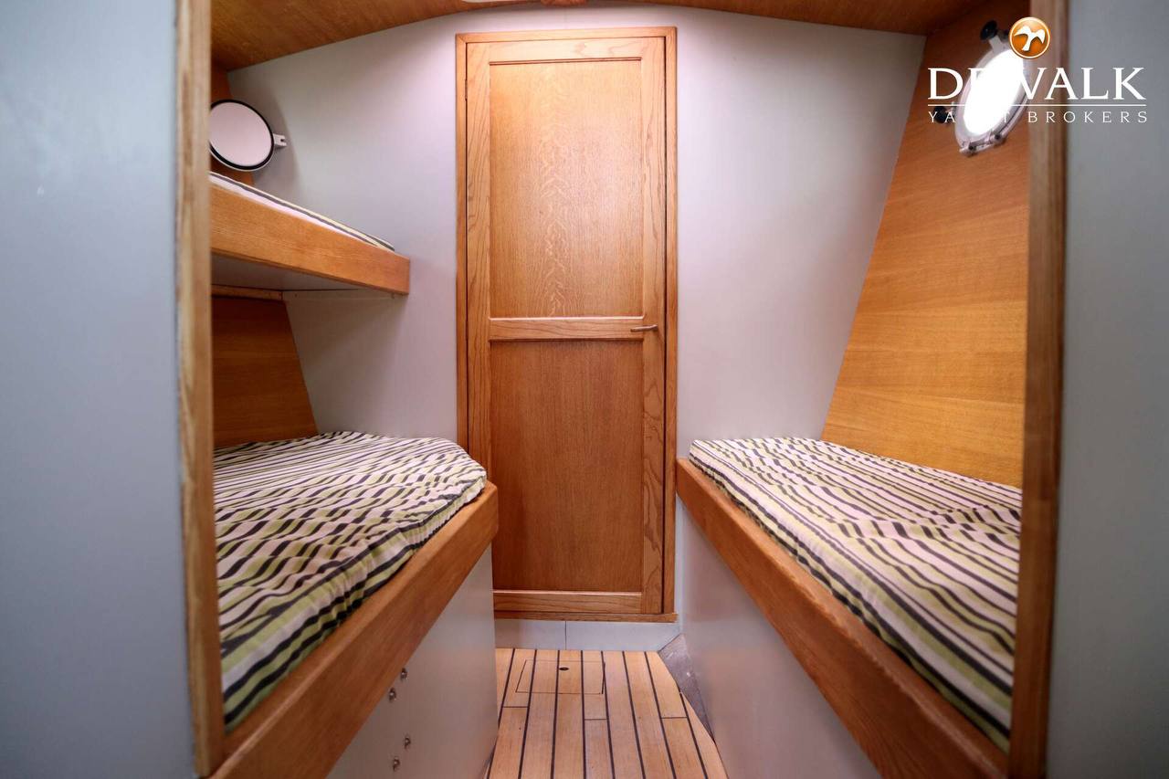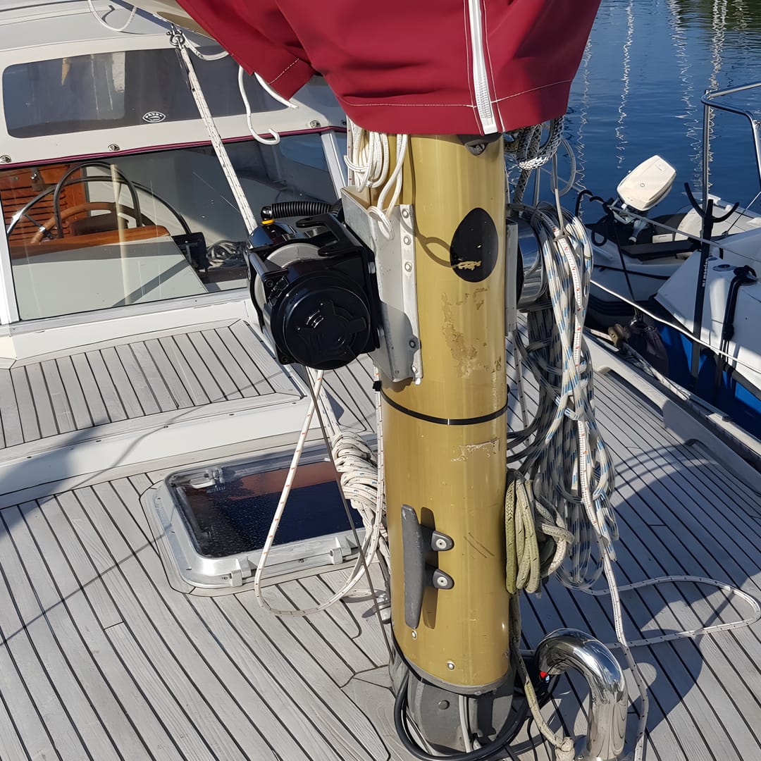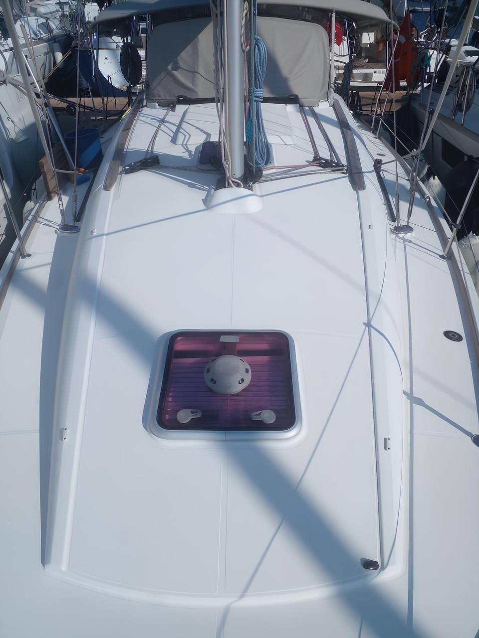 The boat is equipped with a full set of sails, including regatta main, genoa, jib, storm jib, and spinnaker. The aluminum mast, boom, and spinnaker pole are paired with Dyneema backstays and high-quality Lewmar winches for reliable handling.