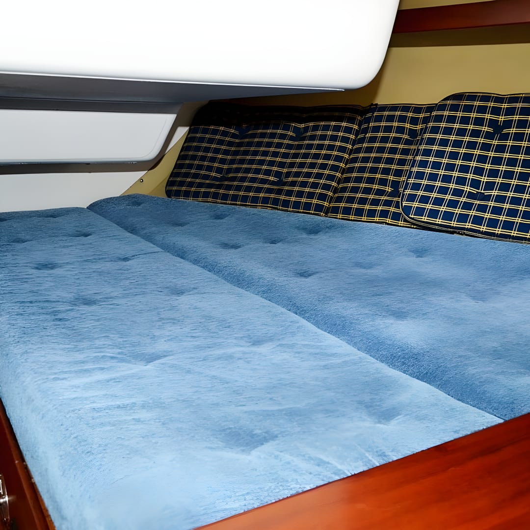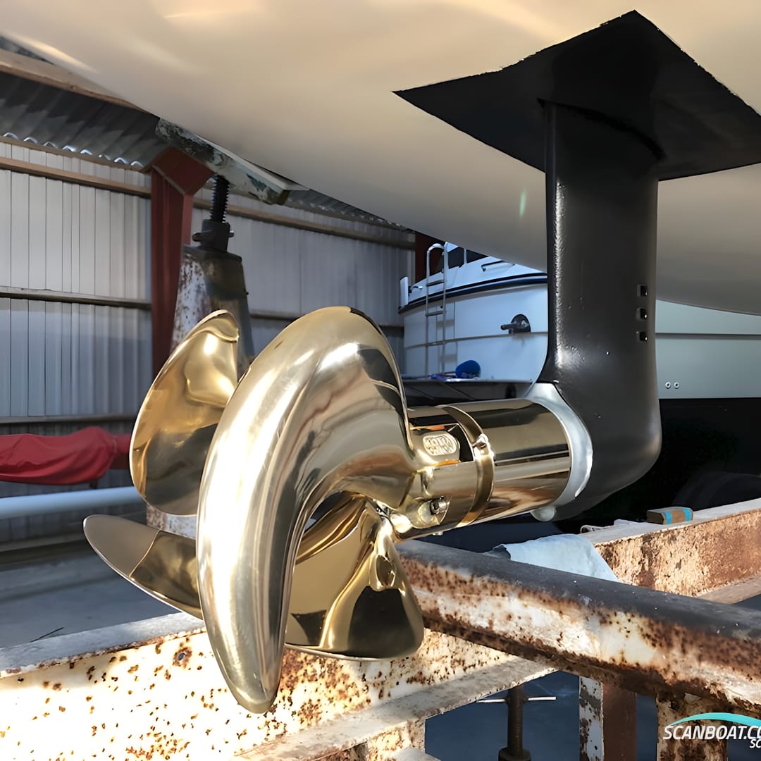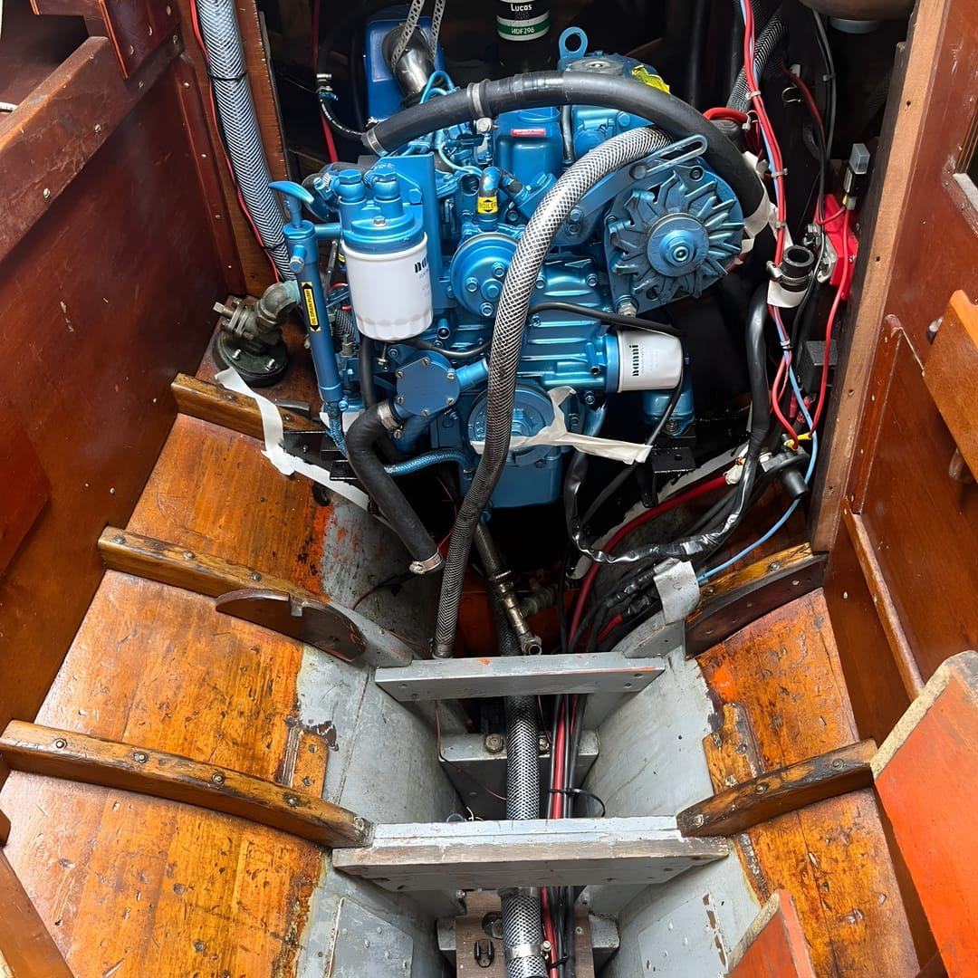 The Yanmar 2GM20 engine has regular oil and filter changes. A new air filter and impeller are scheduled for 2025. The folding propeller helps with maneuvering in tight harbors.